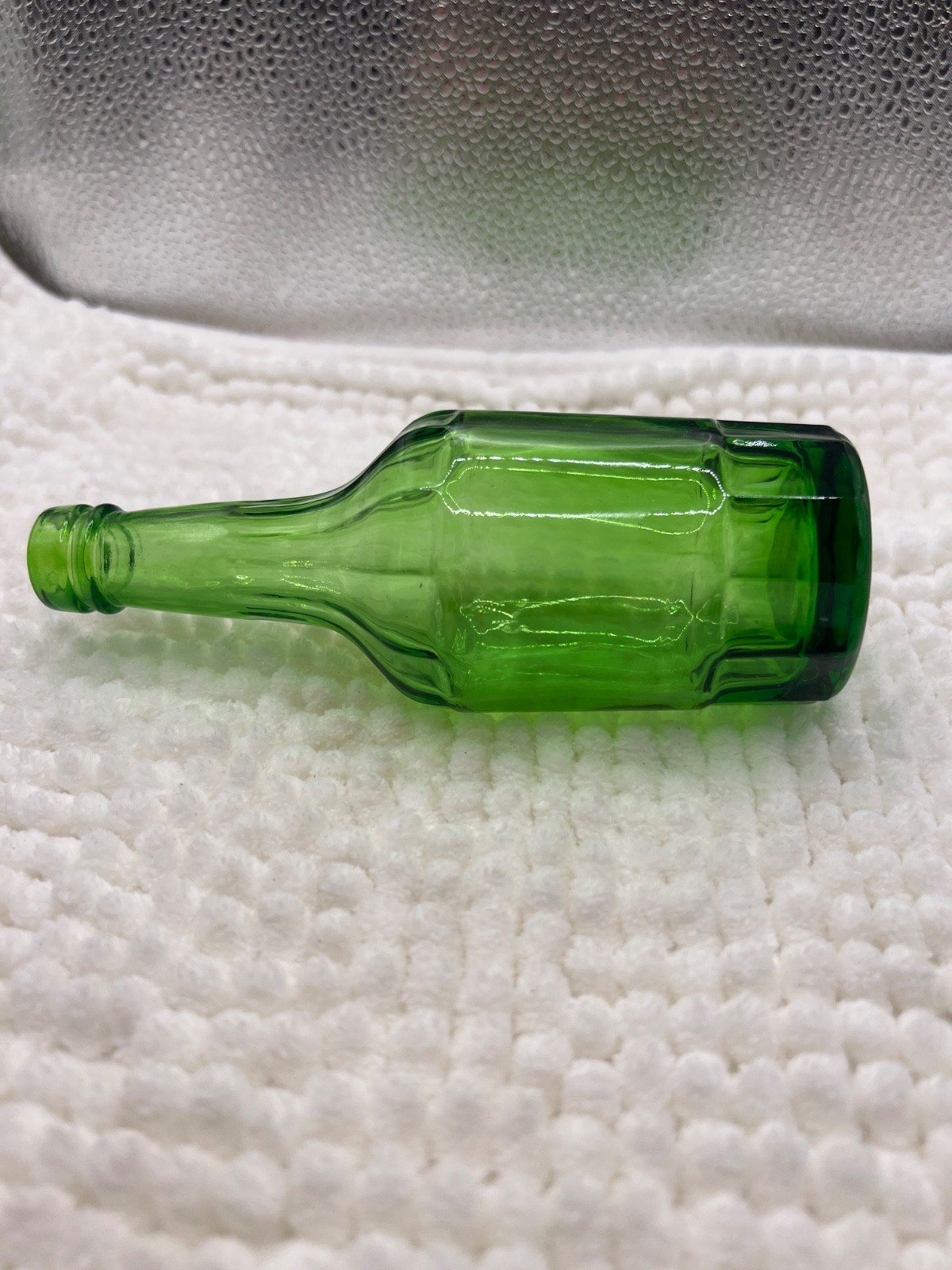This vintage green Wheaton N. J. glass bottle with a 5 1/2" long neck is a unique collectible piece from the United States. The bottle's color and specific measurements make it stand out among other modern bottles in the collection. Its rarity and origin add to its charm and historical significance, making it a desirable item for collectors of vintage bottles.