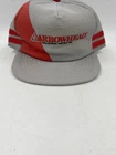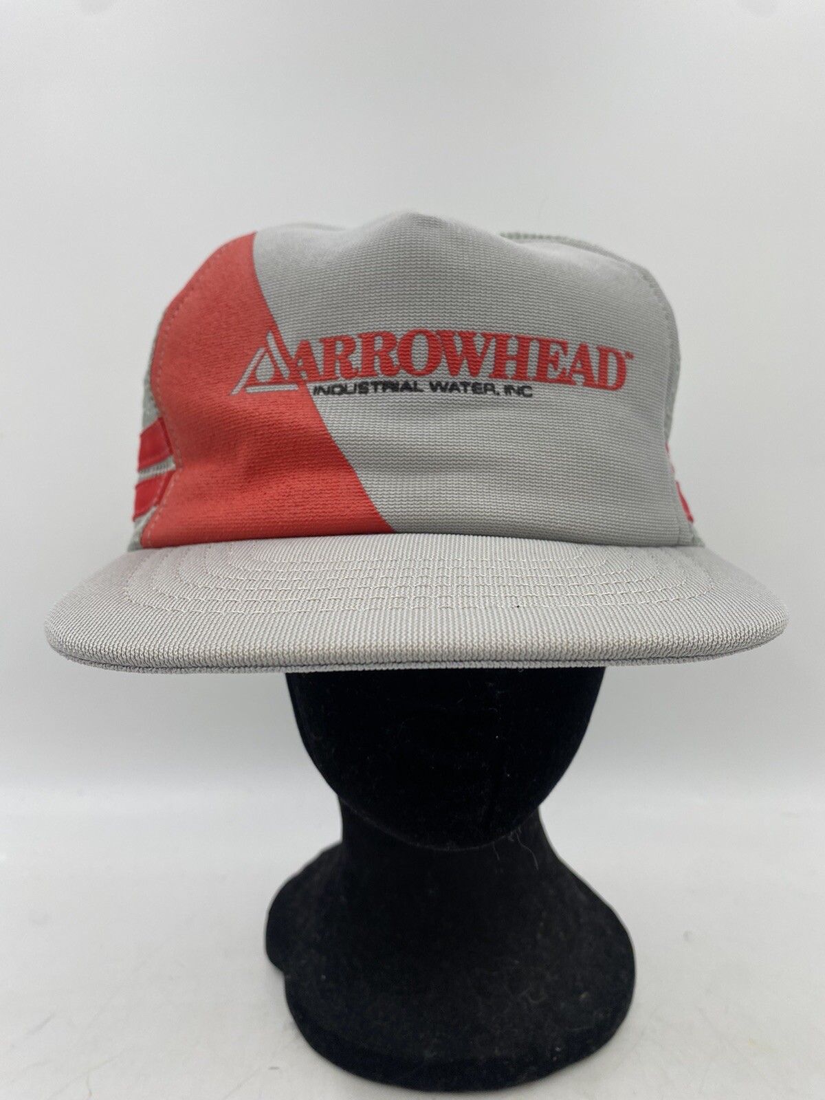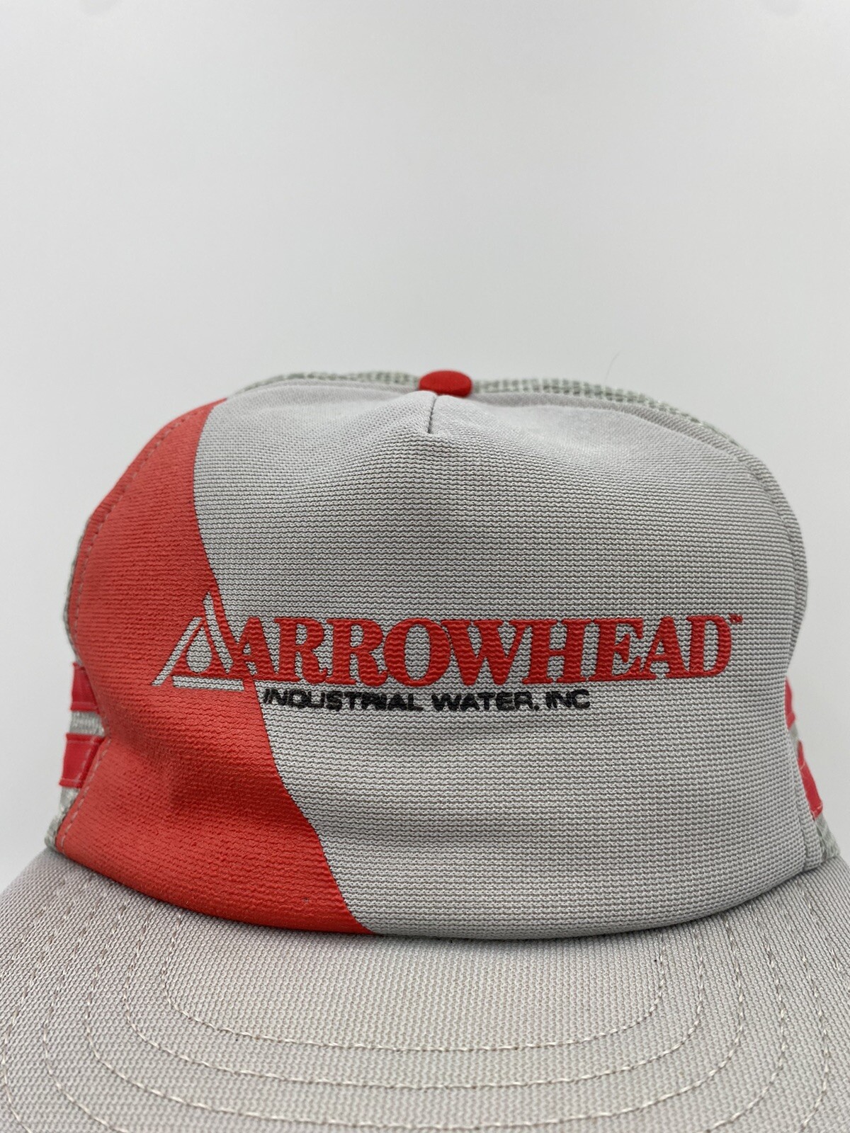 This vintage Arrowhead Industrial Water Inc. mesh back cap has two red striped on the side. It is a snap back and one size fits most. This is in very good condition with minimal signs of wear. It does have a little misshape to it. You get the actual item pictured so please look at all photos and ask any questions before purchase.