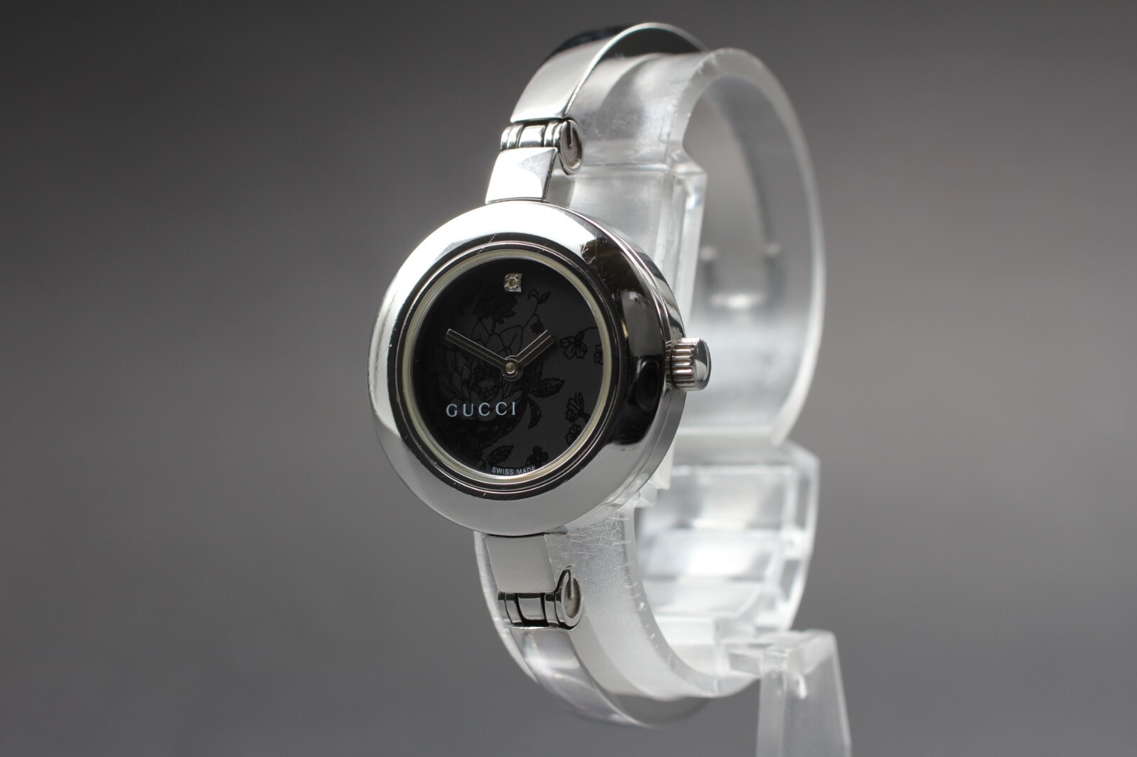 Absolutely love this vintage Gucci watch! The black dial with floral diamond accents is stunning, and the near-mint condition makes it feel brand new. The stainless steel case has minimal wear, just a few light scratches—nothing noticeable. It keeps perfect time and looks elegant on the wrist. A true classic piece that adds luxury to any outfit. Great purchase!