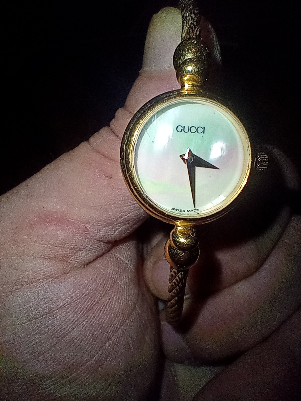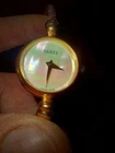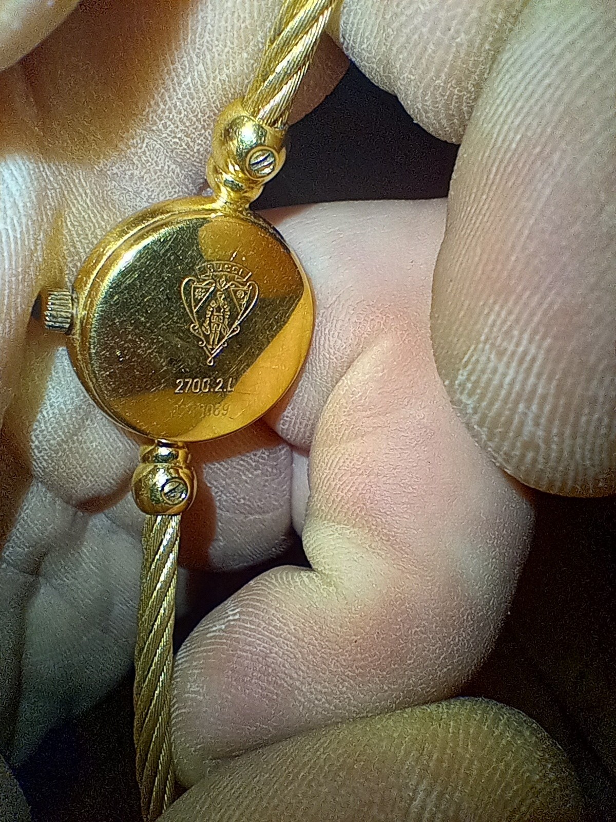 The [Exc+5] Gucci 2700.2.L Women's Quartz Watch is a vintage timepiece featuring a gold bangle band and a shell dial. This Swiss-made watch has a quartz movement and is adorned with a multicolor bezel, making it a stylish and classic accessory for any occasion. With a twist band, pressure caseback, and a round case shape, this handmade watch is a luxurious addition to any jewelry collection. Perfect for those who appreciate timeless elegance and quality craftsmanship.