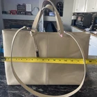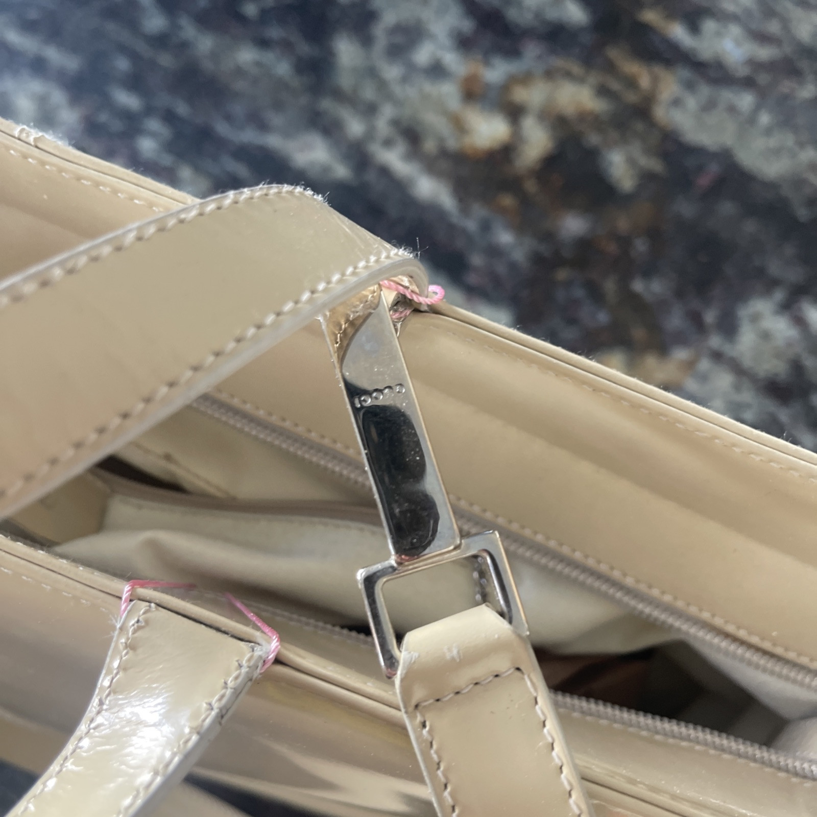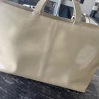 Vintage Gucci patent leather tote in a natural tan color, featuring a solid pattern and zip closure. The double handles are also made of patent leather in a beige color, and the lining is crafted from a combination of felt and canvas in a beige color. This large tote is an excellent choice for women who value style and practicality, with accents provided by the zipper. It is a lined tote that comes with a zip closure and was made in Italy. Lining has been cleaned out. It is a vintage bag but it is in great condition. Has also been authenticated