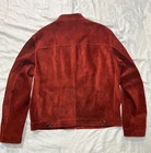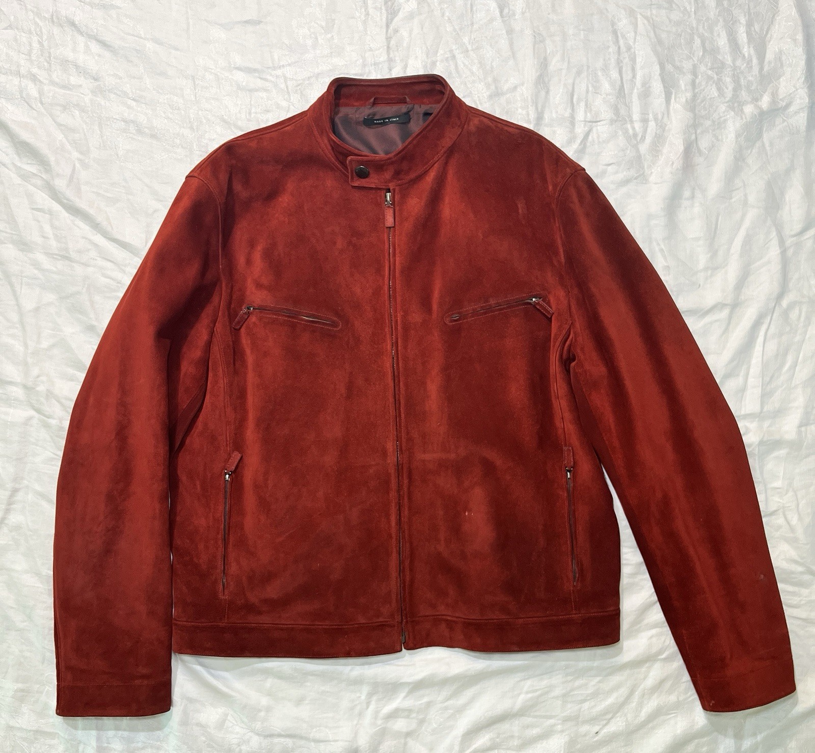The Vintage Gucci Burgundy Leather Moto Style Men’s Jacket in size 58 (XL) features a solid red color with the iconic Gucci logo accent. Made in Italy, excellent condition. Pit to pit: 25.5 inches Sleeve length: 27 inches Body length: 27.5 inches