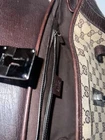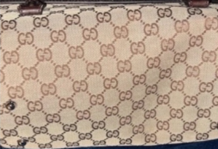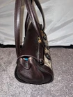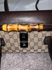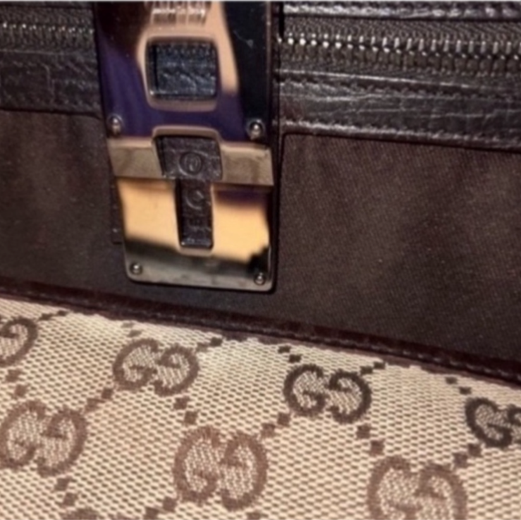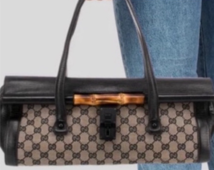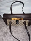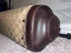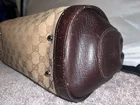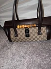 This is a Gucci top handle bag featuring a brown monogram canvas with a semi-circle shape, brown bamboo handle, and brown lining. The medium-sized bag has a 16" width, 11" height, and 1" depth. It has a monogram pattern, no closure, and comes with original dust bag. The model is called Peggy and it is part of the Gucci product line, made in Italy.