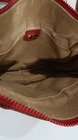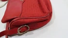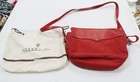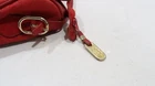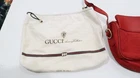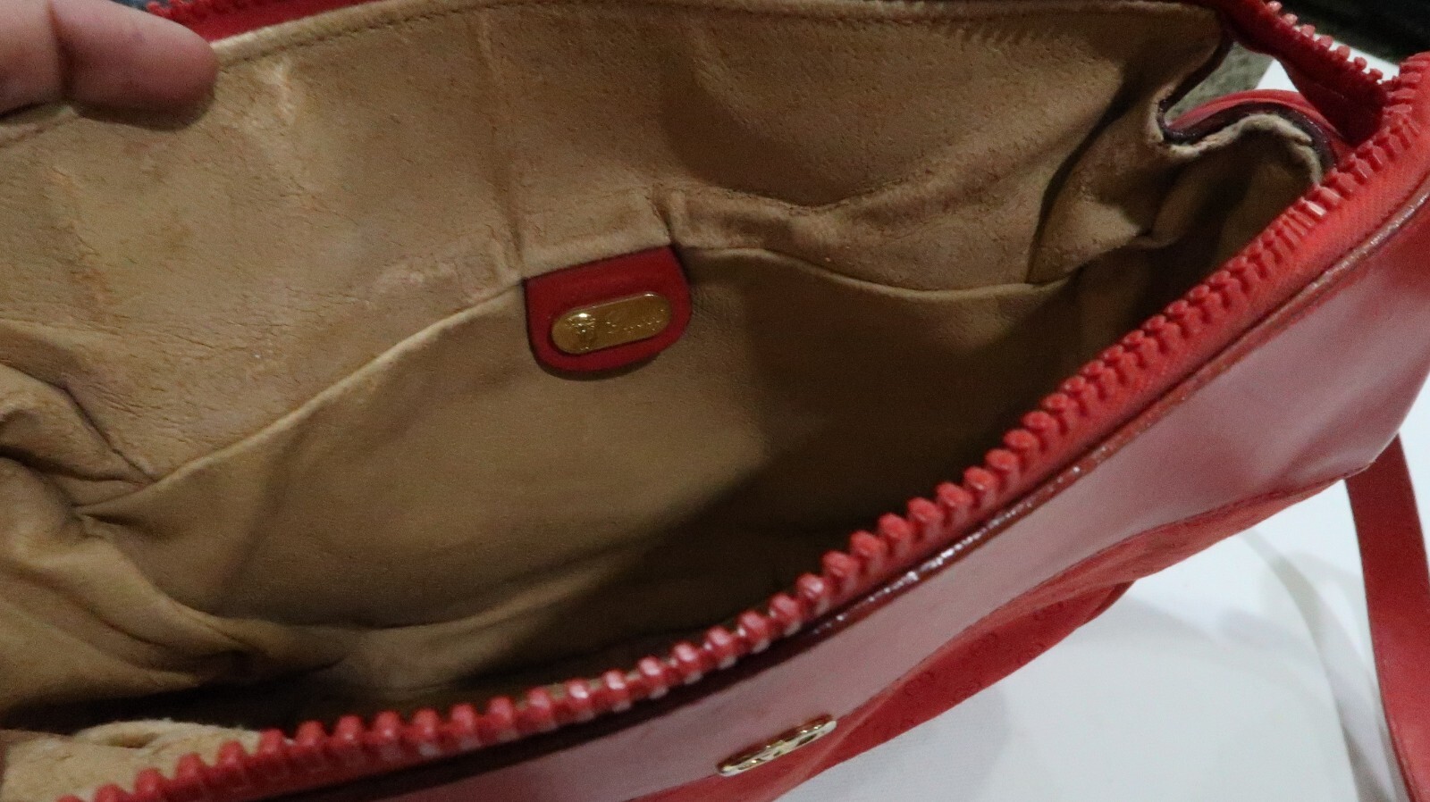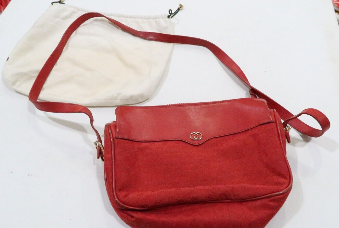This is a beautiful vintage Gucci bag in red. It has GG monogram all over it on the red canvas with red leather on top. The trimming has wear on it. This is an old bag. There is a lot of wear on it. Still in good condition. But please don't expect vintage bags to be in perfect condition.There is color loss on the gold tone zipper pull. The zipper closes the bag. The inside if tan suede. The seude is worn, still in good condition. You can see the serial number '01-37-4001' behind the tag inside the body that says 'Gucci Made in Italy'. Strap is in good condition with wear. It has a drop of 18 inches. Can be worn as a shoulder bag or a crossbody. Bag is 10" x 8" x 2". Comes in the dustbag shown in the pictures which says 'Gucci Accessory collection'. Whole thing weighs close to a pound. Vintage bag sold in vintage condition.