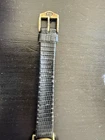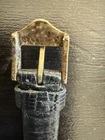 Authentic vintage Gucci 3000L Swiss quartz wristwatch. Gold-tone bezel with black dial and Roman numerals. Features the original black leather strap marked “Hadley Roma France” and a Gucci-signed buckle. Condition: • Watch is not currently running – likely needs a new battery or servicing. • Crystal has visible scratches. • Gold plating shows tarnishing and wear. • Strap is original but heavily worn and cracked. • Back reads: “Gucci 3000L Swiss Made” with crest and serial number. Details: • Model: Gucci 3000L • Movement: Quartz (Swiss Made) • Dial Color: Black • Band Color: Black • Case Size: ~26mm • Style: Dress / Classic • Department: Unisex • Year Manufactured: 1980s–1990s • Band Material: Leather (genuine, original) Sold AS-IS for parts or repair. No returns. Please review all photos for full condition details.