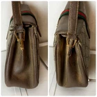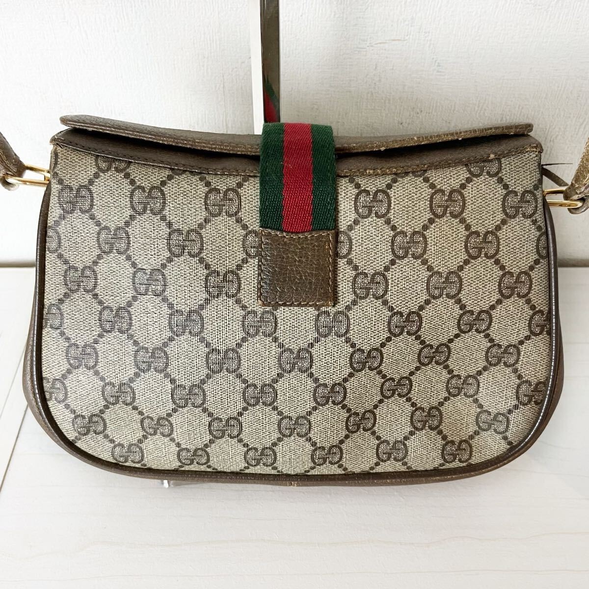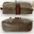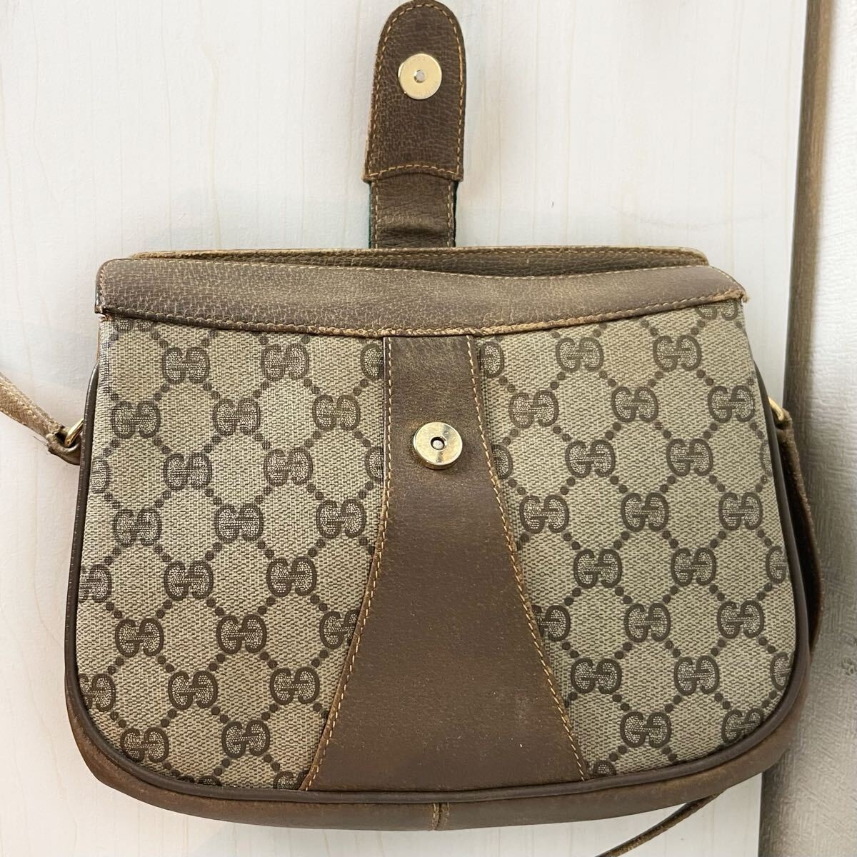 GUCCI vintage shoulder bag cross body pouch. The material is leather and canvas with a sherry line, GG pattern, and gold hardware. The bag measures approximately 7.09 inches tall, 9.45 inches wide, and 2.76 inches deep. The shoulder strap length is approximately 39.37 inches and is not adjustable. It features one outer compartment and an inner zipper pocket. There is slight fading on the shoulder strap (as shown in photo 10). The inside has some signs of use, but is generally clean. The color is beige. I promise fast shipping via FedEx or DHL as soon as possible! Import duties, taxes and charges are not included in the item price or shipping charges. These charges are the buyer’s responsibility. These charges are normally collected by the delivering freight (shipping) company or when you pick the item up - do not confuse them for additional shipping charges.
