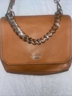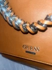 ****Inside has some marker or pen marks.*** This vintage Guess shoulder bag is a stylish addition to any wardrobe. The brown PU exterior features a square shape and a magnetic closure. The top handle and chain strap have a brown woven design with gold hardware accents, including the brand name logo and a wrapped top handle chain. The bag has a medium size with a 10-inch width, 8-inch height, and 3-inch depth. The interior has a brown fabric lining with inner pockets, dividers, and an adjustable strap. The bag is suitable for travel, party/cocktail, casual, workwear, and business occasions.