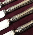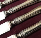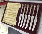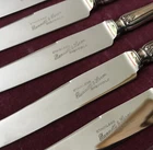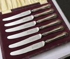 ANTIQUE VINTAGE HM HALLMARKED HM SILVER DINNER DESSERT BUTTER KNIVES BOXED SET - CUTLERY The box appears to be original to the knives Hallmarked Silver Handles bear marks for Sheffield - date letter C and maker CHB Blades are stainless steel and marked Bennett & Heron Stainless Sheffield Measures 17cm long Very Good vintage pre-owned condition. Box also in good condition