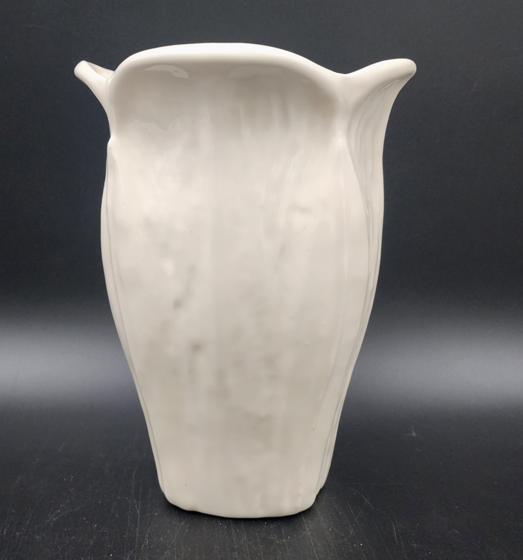 This is a vintage Haegar ceramic vase, number 808-24. The cream colored vase has a raised relief leaf pattern and is reminiscent of art deco style decor.