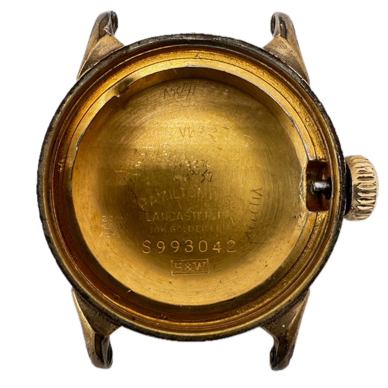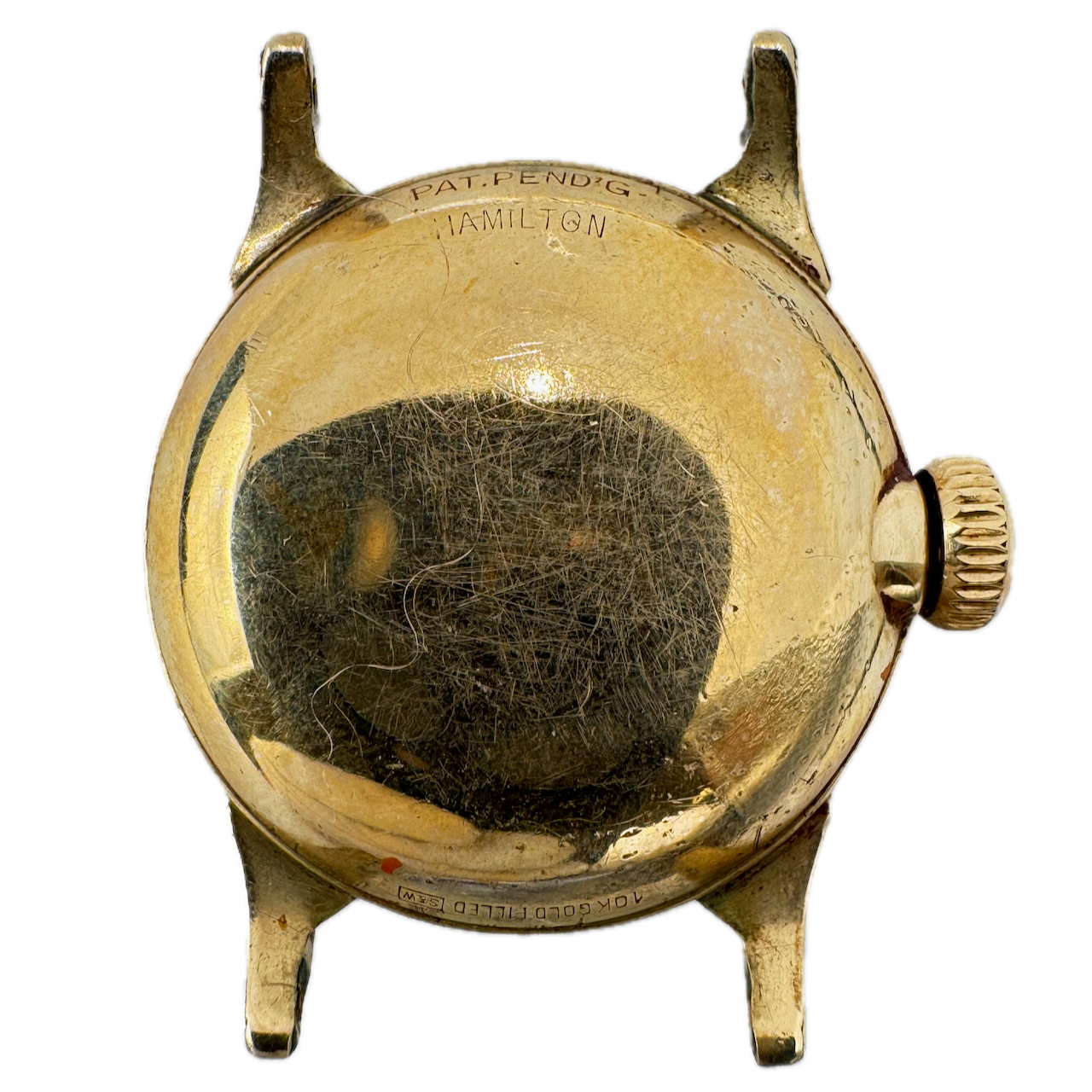 Vintage Hamilton Military Style Men's Mechanical Wristwatch 10k Gold Filled Product Description Item: Wristwatch Brand: Hamilton Model: Military Style Movement: Mechanical Case Material: 10k Gold Filled Gender: Men's Size: 29.5mm Product Measurements Diameter: 29.5mm Lug Width: 16mm Lug to Lug: 37mm Thickness: 11.5 mm Product Condition Overall Condition: Fair, overall condition for its age. Functions: Not running but the balance complete is in good condition. Case: There are scratches on the case. Crystal: There are scratches on the crystal. Dial: The dial has discoloration. Crown: The crown is worn. About the brand: Producing their first pocket watches in Lancaster, PA as early as 1892, Hamilton watches are one of the most recognizable American watch brands. While they moved production of their watches to Switzerland in 1969, the American catalog of Hamilton watches is impressive. Recognizable models such as the Ventura, worn by Elvis Presley, and their WW2 military issue “Khaki” watches, Hamilton still enjoys a large presence in the market today. Offering both well made modern pieces and a backlog of wonderful vintage items - Hamilton offers much for the vintage and modern collector.