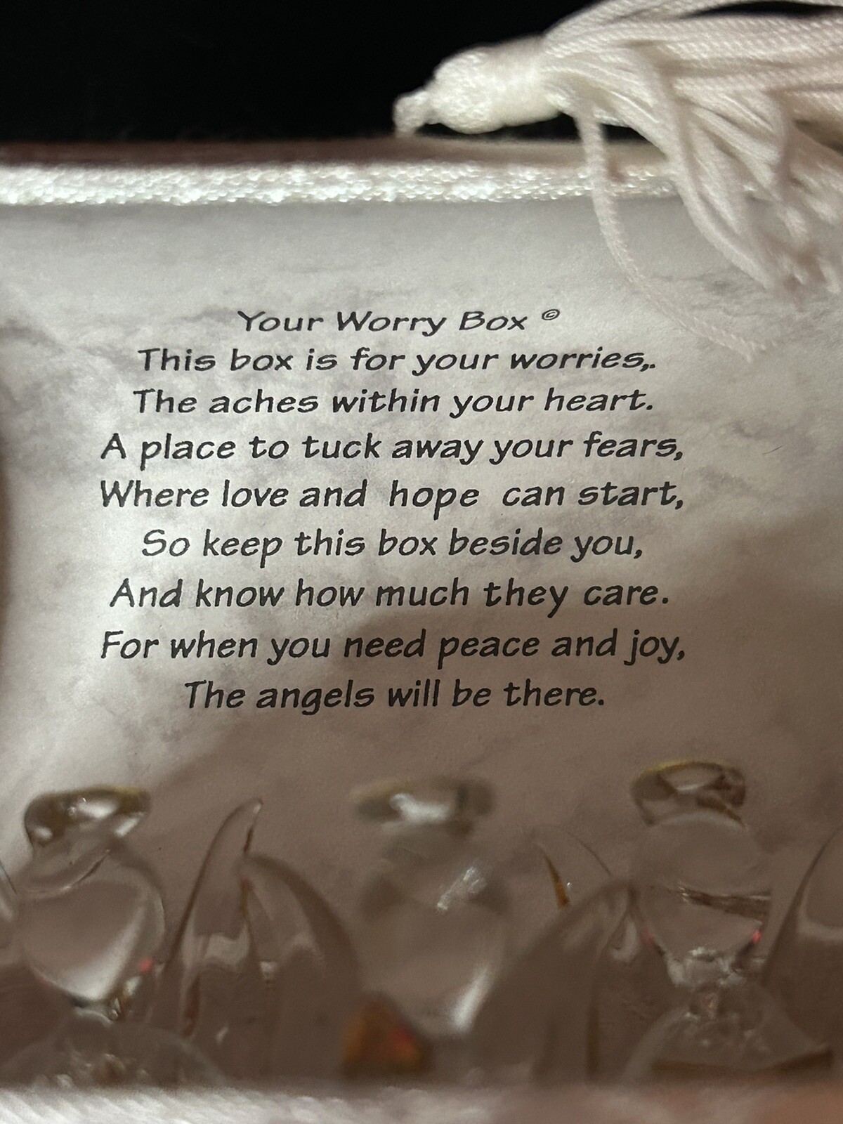 This vintage You're Worried Box 3 is a unique collectible item that features a hand-blown glass angel figurine with a poem inside. The box is packaged in a beautiful box, making it an ideal gift for collectors or boxing enthusiasts. The figurine is made of high-quality glass, and the box is designed to showcase it perfectly. The item is categorized under Collectibles, Decorative Collectibles, and Sculptures & Figurines, making it a must-have for collectors of all kinds. The box is designed with the word "boxing" in mind, and it's perfect for display in any room. This is a rare item that will surely be a conversation starter.