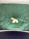 The product is a vintage hand-carved polar bear figurine made of white stone onyx, standing at 1.5 inches tall with a polished finish. The sculpture features intricate carvings, depicting a bear in a realistic manner. It is categorized under collectibles and decorative sculptures, suitable for all occasions as a small and charming decor piece. The item is part of an animals collection, specifically themed around animals and dinosaurs.