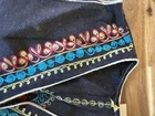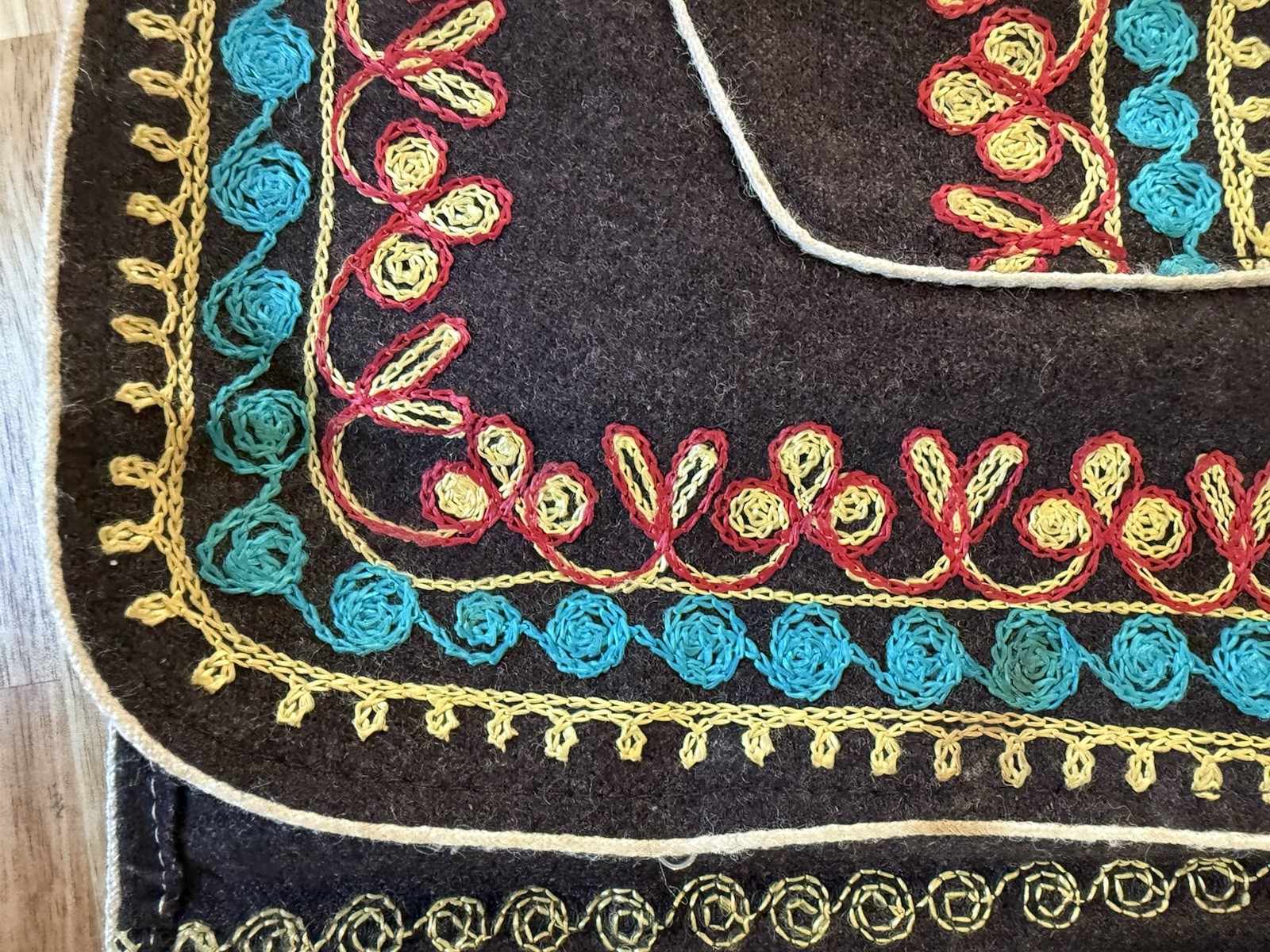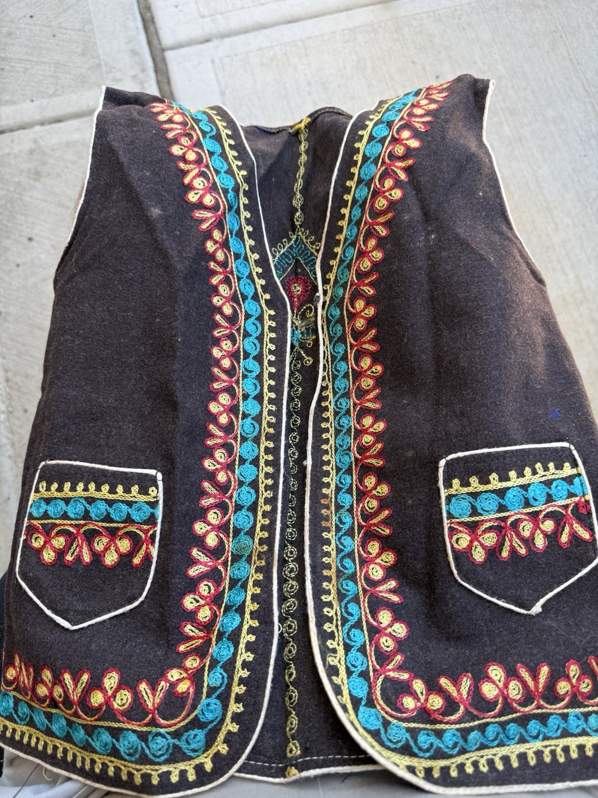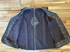 Beautiful vintage hand-embroidered wool vest featuring traditional Kashmiri chain-stitch embroidery in vibrant red, turquoise, and golden threads. This artisan-made piece showcases intricate floral and paisley motifs on a deep brown wool base — a true example of traditional craftsmanship. Fully hand-stitched embroidery decorates both the front and back, with twin front pockets and delicate edging throughout. The vest is unlined and made from soft, medium-weight wool, perfect for layering over a blouse, sweater, or dress. Details: • Size: Small • Material: 100% Wool • Color: Deep brown with multicolor embroidery (red, turquoise, gold) • Style: Bohemian / Ethnic / Folk / Artisan / Kashmiri • Features: • Hand embroidery throughout • Two front pockets • Open front • Unlined wool body • Condition: Excellent vintage condition. Clean with no stains or holes. Minimal expected wear consistent with age. This unique handmade vest is ideal for collectors of ethnic textiles, boho fashion lovers, or anyone who appreciates fine traditional embroidery. A wearable work of art that adds warmth and color to any outfit. ⸻ Shipping & Handling: Ships carefully folded and protected. Same or next-day shipping with tracking.