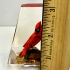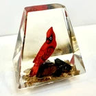 This vintage paperweight is a one-of-a-kind piece that features a hand-carved and painted cardinal. Made in Canada, this unique collectible is perfect for those who appreciate the artistry of handmade items. The paperweight is made of a combination of wood and lucite, making it a durable and unique addition to any collection. Whether you're a fan of vintage collectibles or are simply looking for a standout piece to display in your home, this cardinal paperweight is sure to impress. • Size: 3”h x 2-1/2”w x 2”l * Condition: Great pre-owned, vintage condition, with little wear.