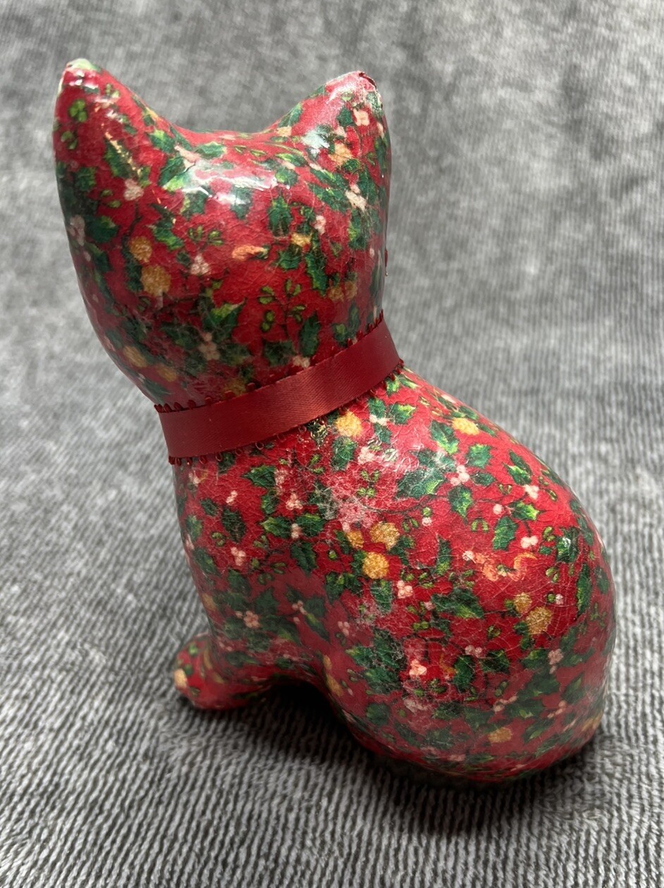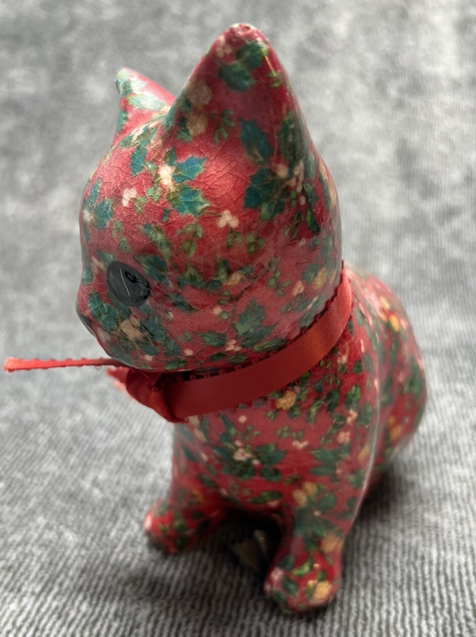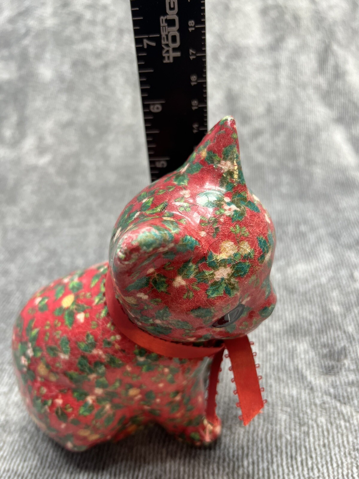 This vintage cat figurine is a charming addition to any collection. The intricate decoupage design showcases a beautiful cat, and the craftsmanship is excellent. Made in the United States, this figurine is a must-have for any cat lover or collector. It would make a great gift or a lovely addition to your own home decor.