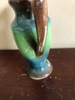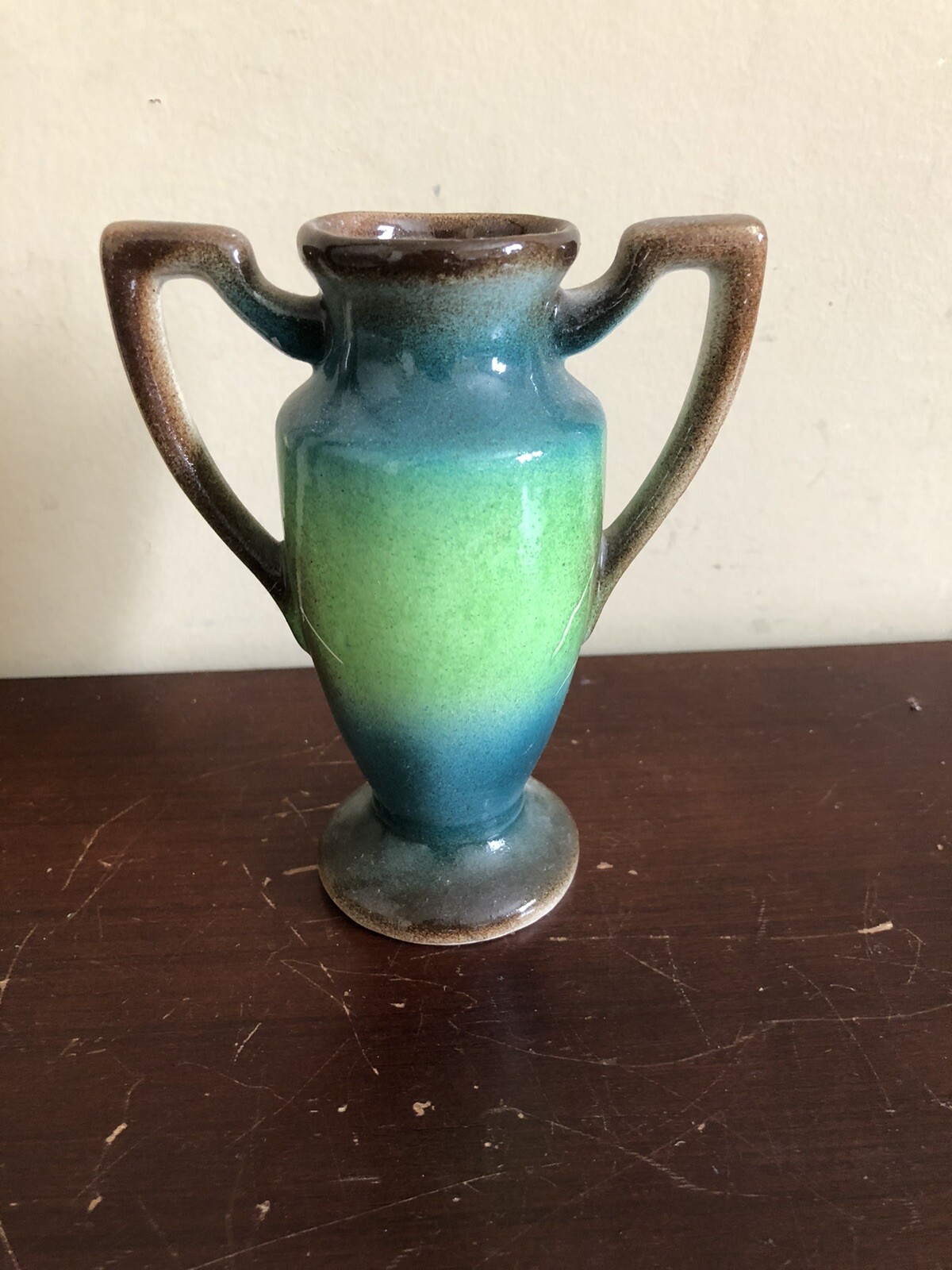 This vintage pottery vase is a unique piece with a multicolor hand-painted flower glaze design. Standing at 5 inches tall, it features dual handles and a glossy finish. The vase is signed by the artist, Ocarks, adding to its charm and authenticity. Made of ceramic using pottery techniques, this Arts & Crafts/Mission Style vase brings a touch of handmade artistry to any space.