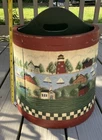 Vintage hand painted wooden bucket with handle magazine holder. Artist signed and dated. Colonial village scene including rolling hills, lighthouse, schoolhouse, church, barn, farmhouse, river, sailboats … Approx 15” high, 12.5” in diameter at widest point. Lots of detail. From a smoke and pet free home.