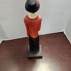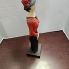 Charming vintage hand-painted wooden figurine of a woman holding an iron. Features vibrant colors and intricate detailing. Ideal as a collectible or decorative piece. • Hand-painted wooden figurine • Stands approximately 10.5 inches tall • Detailed craftsmanship • Vintage aesthetic • Sturdy wooden base Hand-painted wood has some minor wear. Base to top of hat = 10.5 inches.