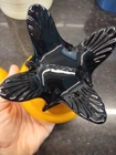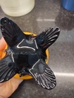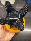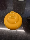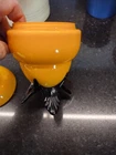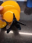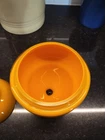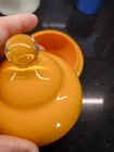 This vintage Czech art glass vase features an all-over orange color, clear round top with a black foot, showcasing abstract art in an apothecary style. Hand-blown in Czechoslovakia, the dish jar is made of glass and bears a printed backstamp. It exudes a unique and artistic charm with its abstract design. There are two small air bubbles as pictured on the lid. No chips or cracks.