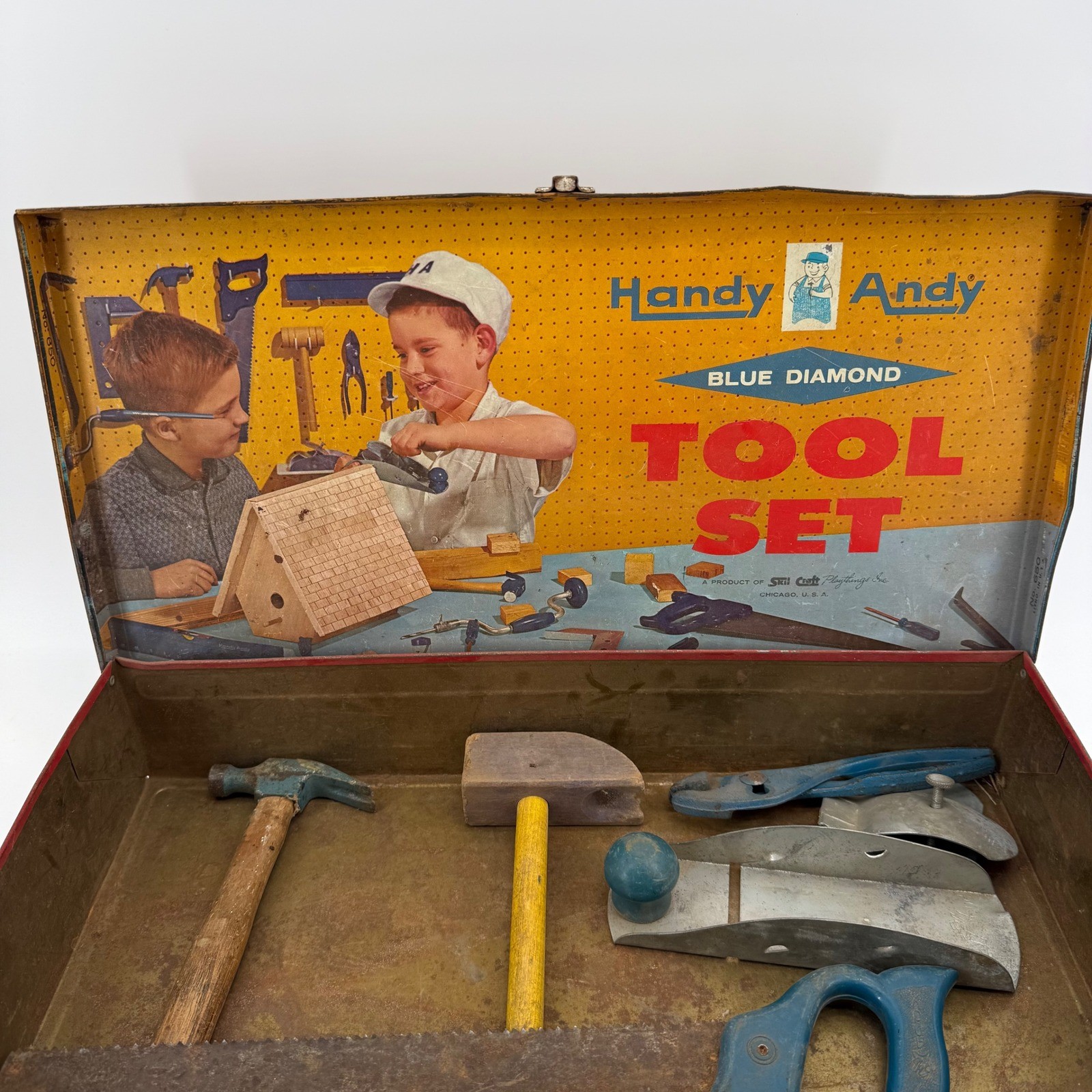Real tools included as pictured. Neat little piece. Vintage Handy Andy Blue Diamond tin litho tool set for children. This classic toy features a vibrant tin case with colorful illustrations of boys working on a birdhouse and other projects. The set includes a hammer, a block plane, a saw, pliers, and a small mallet. This collectible toy offers a nostalgic glimpse into childhood play. Measurements: • Length: 16 in • Width: 8.5 in • Height: 3.5 in Character Family: Handy Manny Age Level: 4-7 Keywords: tin toy, metal lunchbox, retro toy, childrens tools, play set, collectible toy, vintage advertising, toy toolbox, construction toy, nostalgia, educational toy