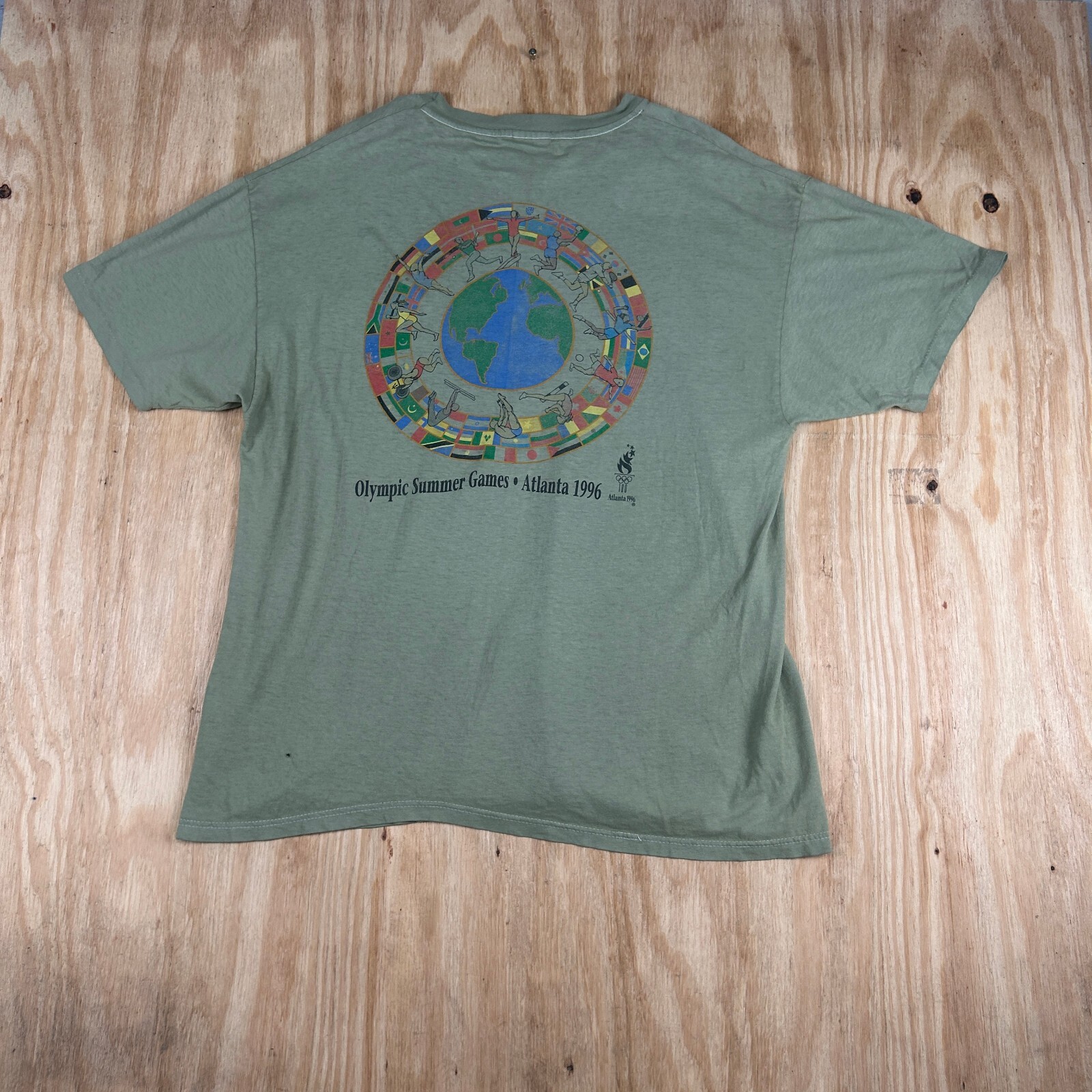 This vintage Hanes Olympic Summer Games Atlanta T-Shirt is a must-have for any sports enthusiast. The shirt features a green cotton knit fabric with a graphic print of the Olympic rings and the Atlanta skyline. It has a crew neck and short sleeves, making it perfect for all seasons. The shirt is machine washable and has easy care features, ensuring that it is comfortable and durable. The shirt is available in a men's size XL and is a regular fit. It is not personalized and is suitable for any unit type. The Hanes brand is known for its quality products, and this T-Shirt is no exception. It is a perfect addition to any sports memorabilia collection or as a casual outfit for any occasion. SKU: PK-36-65