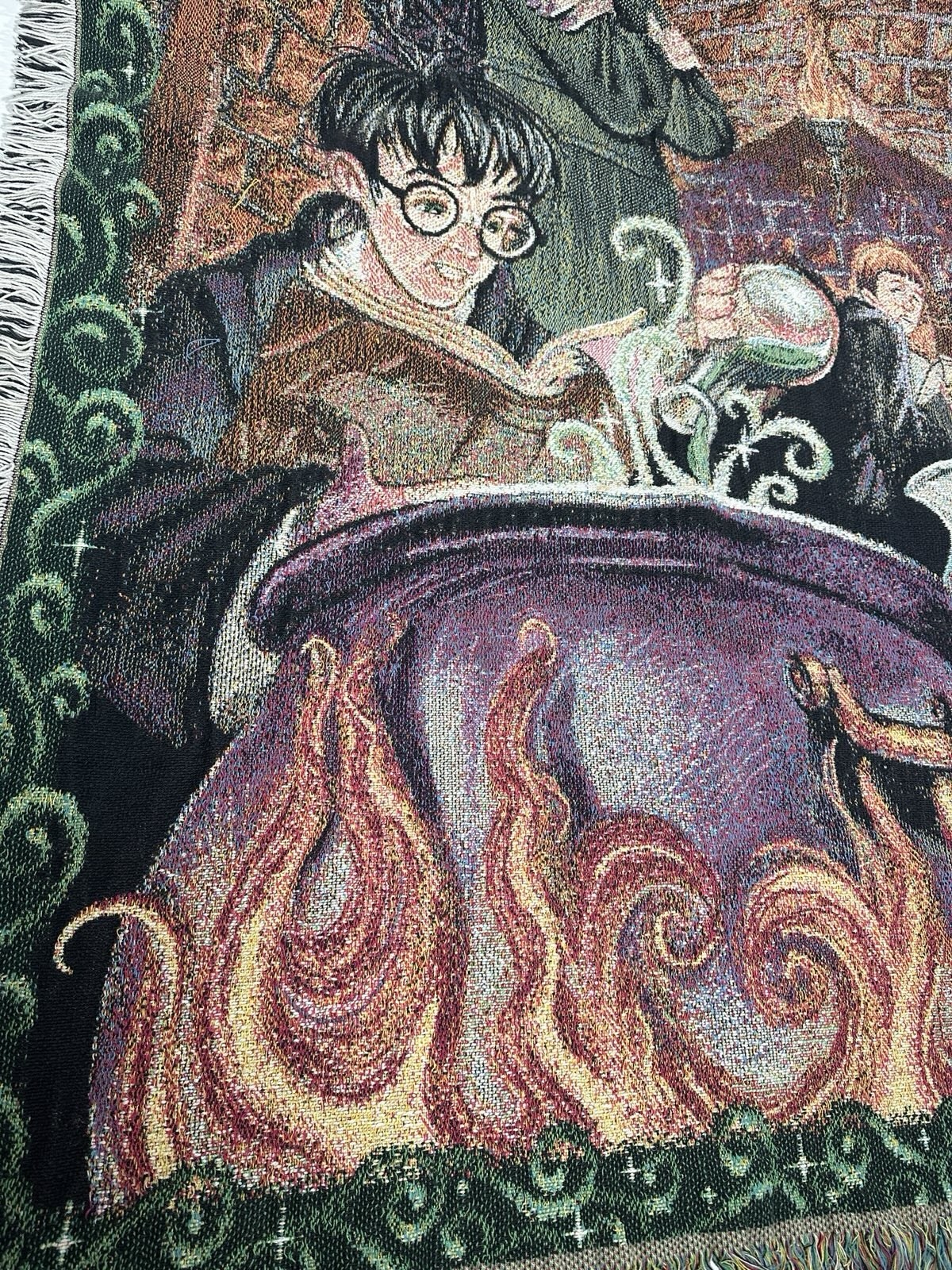 VTG Harry Potter Throw Blanket Tapestry Woven Potions Class Y2K 2000 46x60 RARE Good condition overall - see ALL photos very closely Blanket has mild - moderate basic stress overall throughout - some late snugs /light stress - mild discoloration/fade - etc - see ALL photos very closely for condition of the blanket Will ship with care