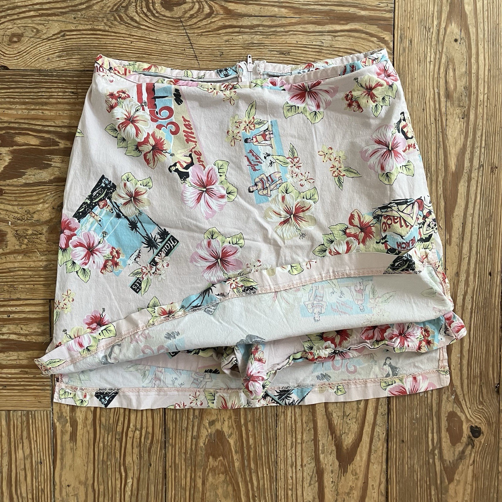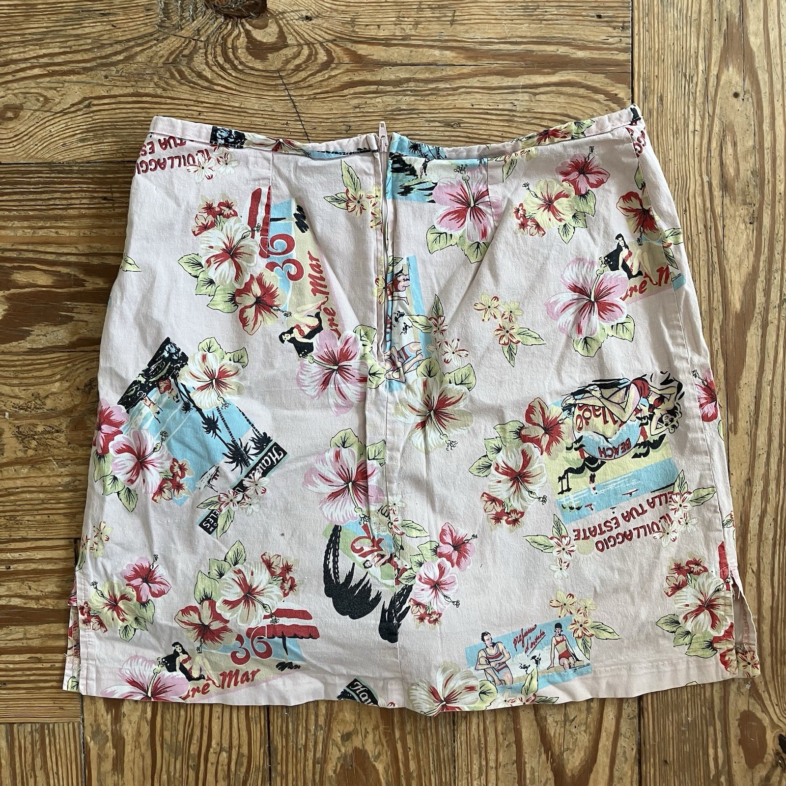 Vintage Hawaiian print mini skort in pink with retro pin-up girls and flowers. Skort style for comfort and style. Great for beachwear, resort vacations, or summer events. Condition: Excellent pre-owned condition. Size: Women’s Small (no size tag — see measurements) Measurements: Waist flat: 13.25” | Length: 16”
