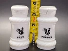 Add a touch of classic farmhouse charm with this vintage milk glass salt and pepper shaker set , featuring bold black rooster graphics and raised rope detailing at the top and base. These shakers stand approx. 4.25" tall and are crafted from white opaque milk glass, a favorite of vintage kitchen collectors. Both pieces are beautifully styled and labeled “SALT” and “PEPPER” in black with a standing rooster in silhouette.