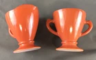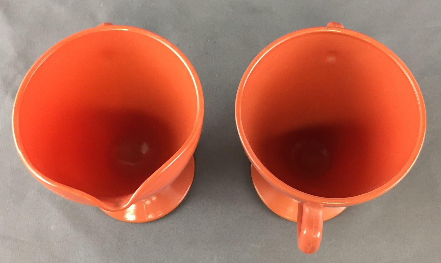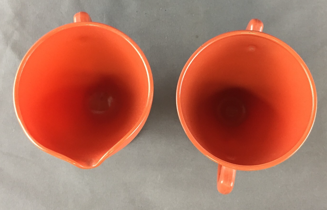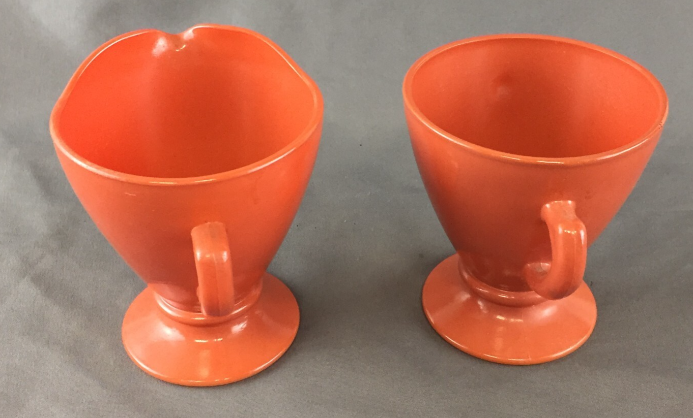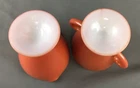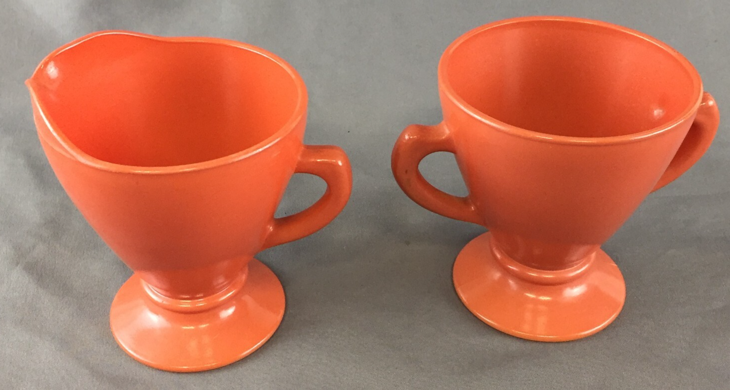 Vintage Hazel Atlas Footed Ovide Rust Milk Glass Creamer and Open Sugar Bowl Creamer measures: 4" tall and 3 1/4" diameter Open Sugar measures: 3 1/8" diameter No breaks, cracks or chips
