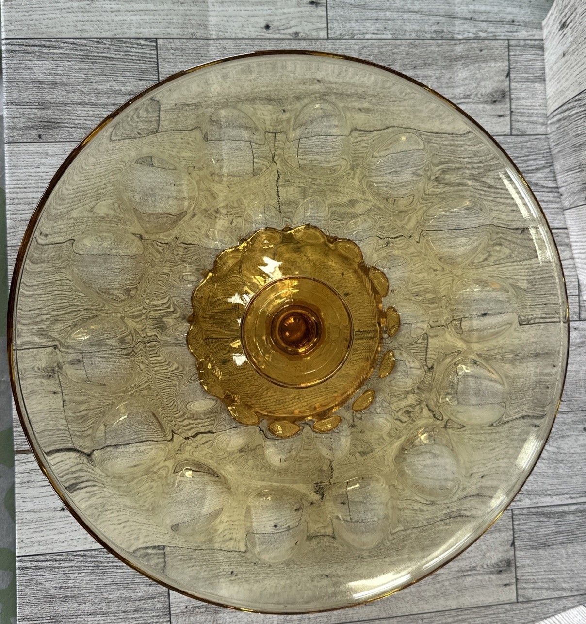 Add a touch of mid-century elegance to your table with this vintage amber glass cake stand from Hazel-Atlas Glass Company. Featuring the iconic Reflection pattern, this piece showcases a scalloped edge adorned with thumbprint impressions, all in a warm amber hue.  • Manufacturer: Hazel-Atlas Glass Company • Pattern: Reflection • Color: Amber • Material: Pressed Glass • Dimensions: Approximately 9¾” diameter x 4” height • condition: good condition review photos for additional condition and description details. • Era: 1950s–1960s    This pedestal cake stand is perfect for serving desserts or as a decorative centerpiece, adding vintage charm to any setting. Vintage Glass Disclaimer Thank you for your interest in this vintage glass item! Please read the following details carefully to ensure you are fully informed before making your purchase: Condition: This is a genuine vintage/antique piece and is sold as-is. It may display signs of age and wear, such as minor scratches, discoloration, or manufacturing imperfections, which are typical for items of this era. I strive to describe all notable flaws accurately and include detailed photos as part of the description. Please review the images carefully, as they are considered part of the listing. Authenticity: To the best of my knowledge, this item is an authentic vintage glass piece from the [specific era, if known]. Use Disclaimer: Due to the items age, this piece is not recommended for food or drink use. It is intended for decorative purposes only. The buyer assumes all responsibility for use or misuse of this item. Packaging and Shipping: I take great care to package each item securely with protective materials to ensure safe delivery. However, I cannot be held responsible for damage that may occur during shipping. If any issues arise, please contact me, and I will assist in filing an insurance claim. Shipping insurance is included with your purchase for added peace of mind. Returns: All sales are final unless the item is significantly not as described in the listing. Please contact me within 3 days of receiving the item if you believe there is a discrepancy. Questions: I encourage buyers to ask questions or request additional photos before purchasing. I?m happy to provide any additional information to ensure your confident in your purchase. By purchasing this item, you acknowledge and accept the terms of this disclaimer.