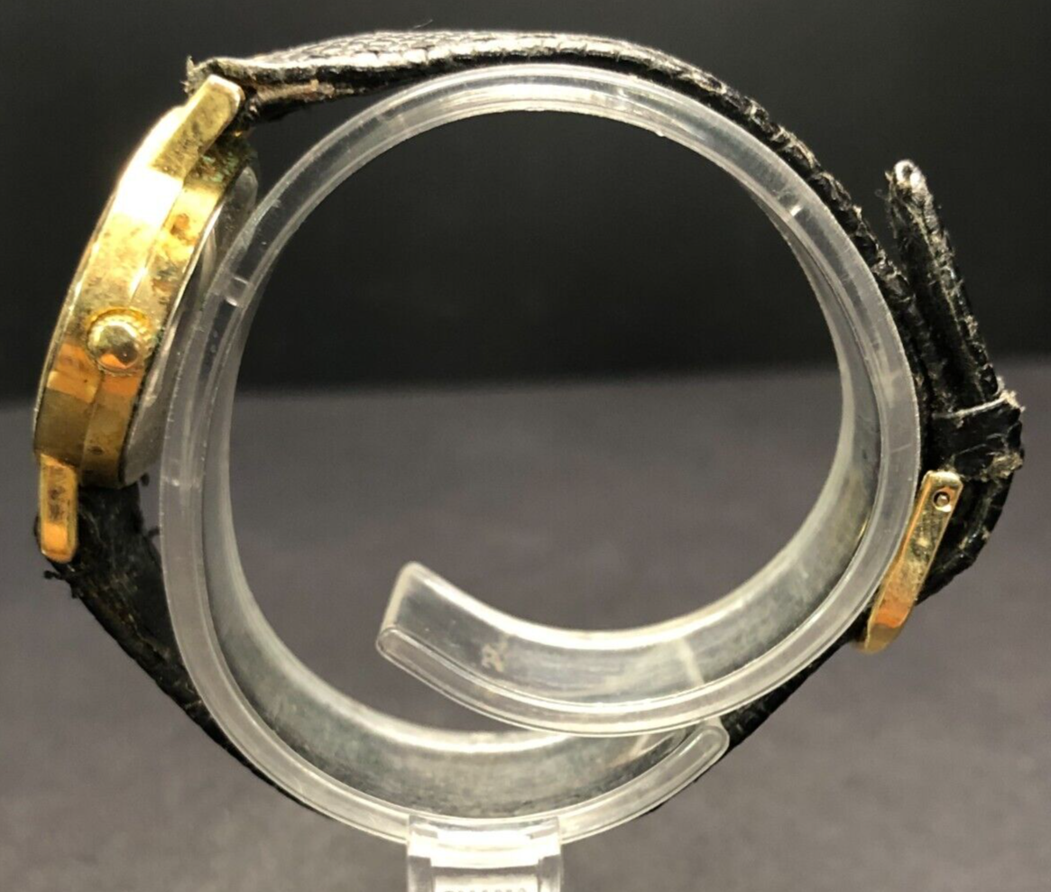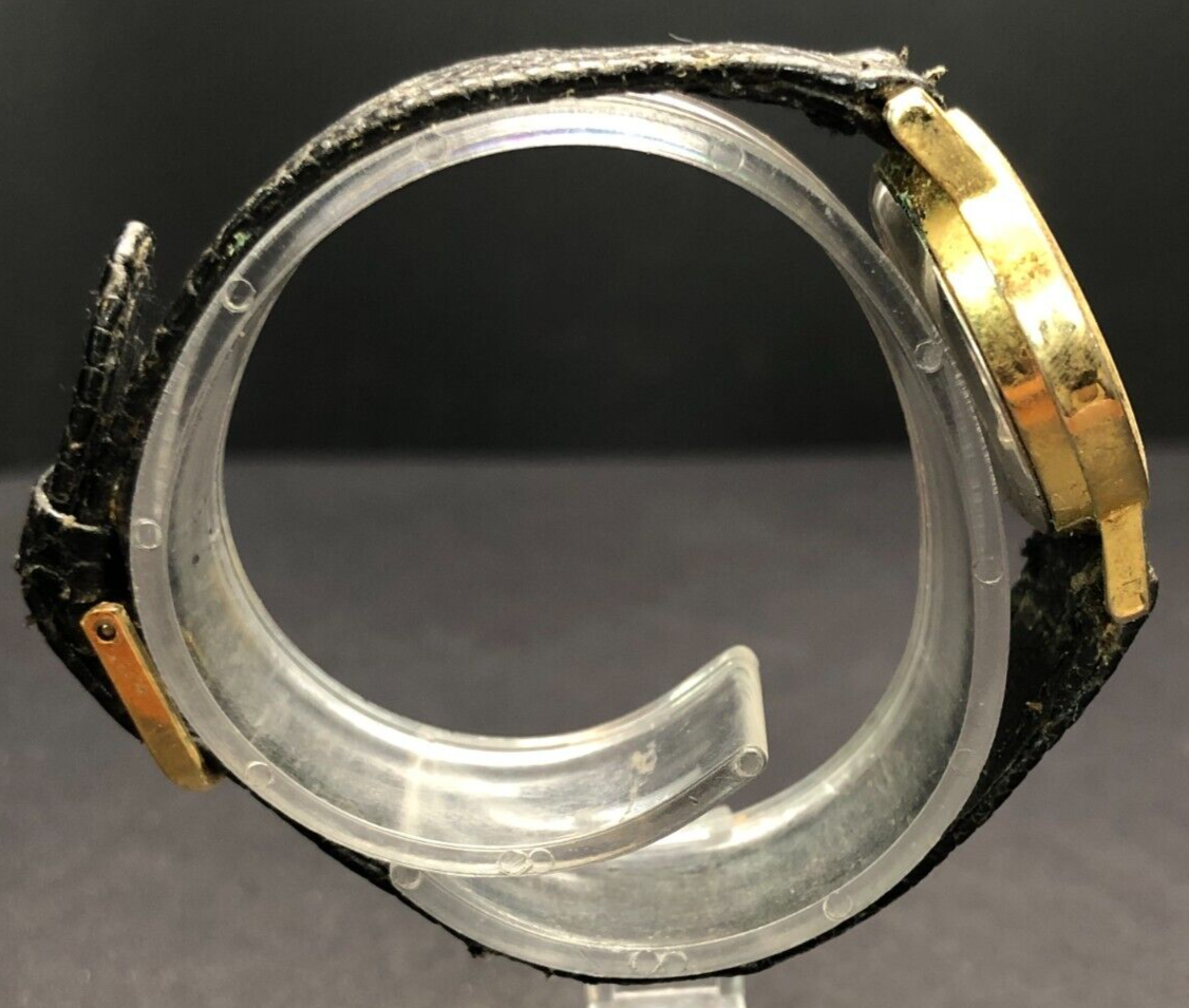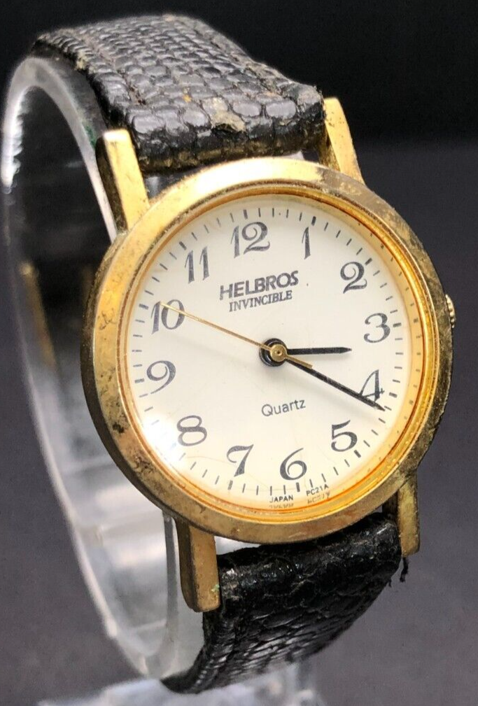 Band Color: Black Brand: Helbros Case Finish: Polished Max Wrist Size: Unknown Band Width: Unknown Bezel Type: Fixed Country/Region of Manufacture: Unknown Caseback: Solid Lug Width: Unknown Features: 12-Hour Dial Department: Women With Service Records: No With Papers: No Watch Shape: Round Movement: Quartz With Manual/Booklet: No Case Thickness: Unknown Case Color: Gold Band Material: Leather Number of Jewels: No Jewels Display: Analog With Original Box/Packaging: No Closure: Buckle Case Material: Stainless Steel Style: Casual Year Manufactured: Unknown Band/Strap: Bracelet Indices: Arabic Numerals Vintage: Yes Dial Color: White Water Resistance: Unknown Bezel Color: Gold Seller Warranty: No Case Size: Unknown Manufacturer Warranty: 1 Month Model: Analog Watch Handedness: Right Theme: Classic Type: Wristwatch Dial Pattern: Logo Handmade: No Customized: No