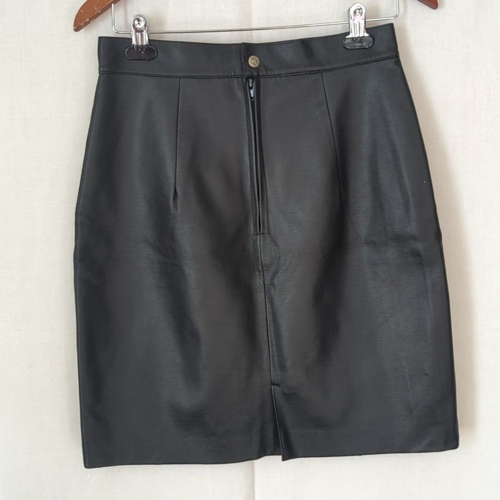 Vintage Helium Authentique size large (check measurements, fits smaller) black in color faux leather material back zip snap closure knee length fully lined darted waist small back slit excellent used condition measurements waist lying flat 14.5 length 21 edgy business emo grunge staple classic timeless dark academia modern dark romance minimalist capsule foundation