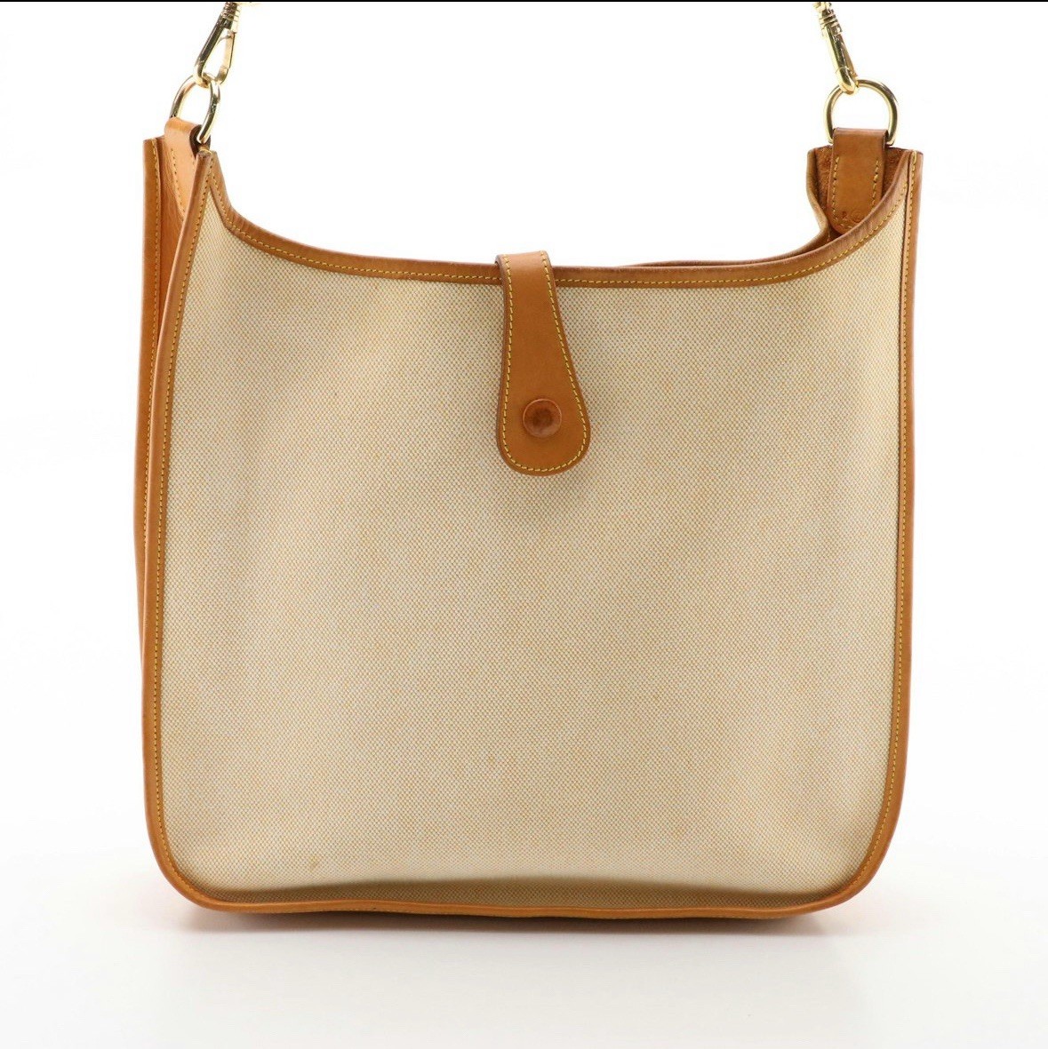 This is an authentic vintage Hermès Evelyne I GM Shoulder Bag crafted from natural Toile canvas and Vache leather in tan. Known for its elegant minimalism and functional equestrian-inspired design, the Evelyne I GM is a collector’s favorite and a versatile wardrobe staple. Condition: Good vintage condition with expected wear for age. Please review photos closely. • Leather: Visible scratches, abrasions, staining, and areas of rubbing/finish loss • Canvas: Minor spot stains present • Hardware: Surface marks and finish wear • Interior: Spot stains, ink marks, lint, and dust accumulation • Odor: Faint storage scent noticeable upon close inspection Bag Details: • Model: Evelyne I GM • Material: Toile canvas & Vache leather • Colorway: Natural / Tan • Dimensions: 12.5” W x 12.0” H x 3.5” D • Strap Drop: 18.5” (non-adjustable) • Closure: Leather tab and snap strap ( no interior or exterior pocket in Evelyne I model) • Includes: Bag only, no box or dust bag Highlights: ✔️ Perforated “H” logo on front panel ✔️ Spacious GM size — great for daily carry ✔️ Timeless vintage French luxury ✔️ Crossbody or shoulder wear functionality ⸻ 💵 Price: $3,499 📬 Open to reasonable offers 🚚 Ships securely with tracking ✅ Guaranteed authentic