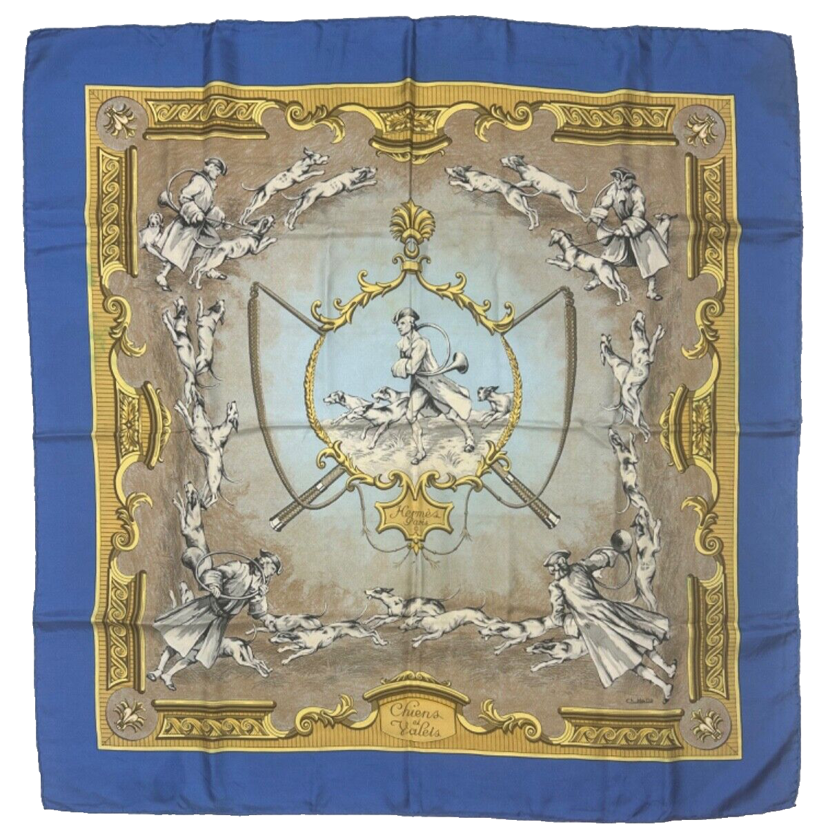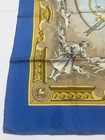 RARE Authentic Hermes Scarf Title: Chiens et Valets Size: 90cm Material: 100% Silk Color way: Blue Made in France Very good vintage condition A few issues as displayed in the pics. Care tag has been removed