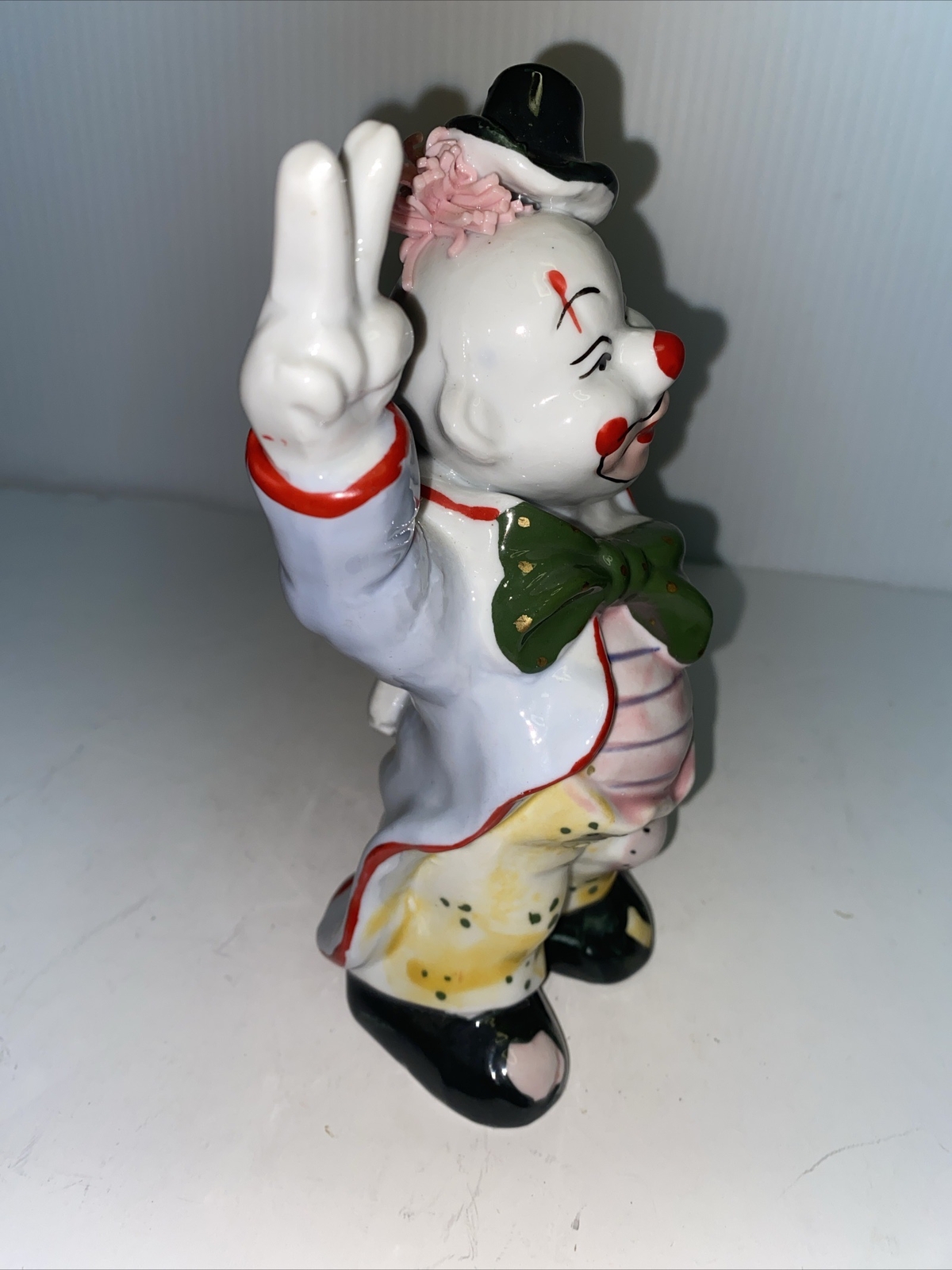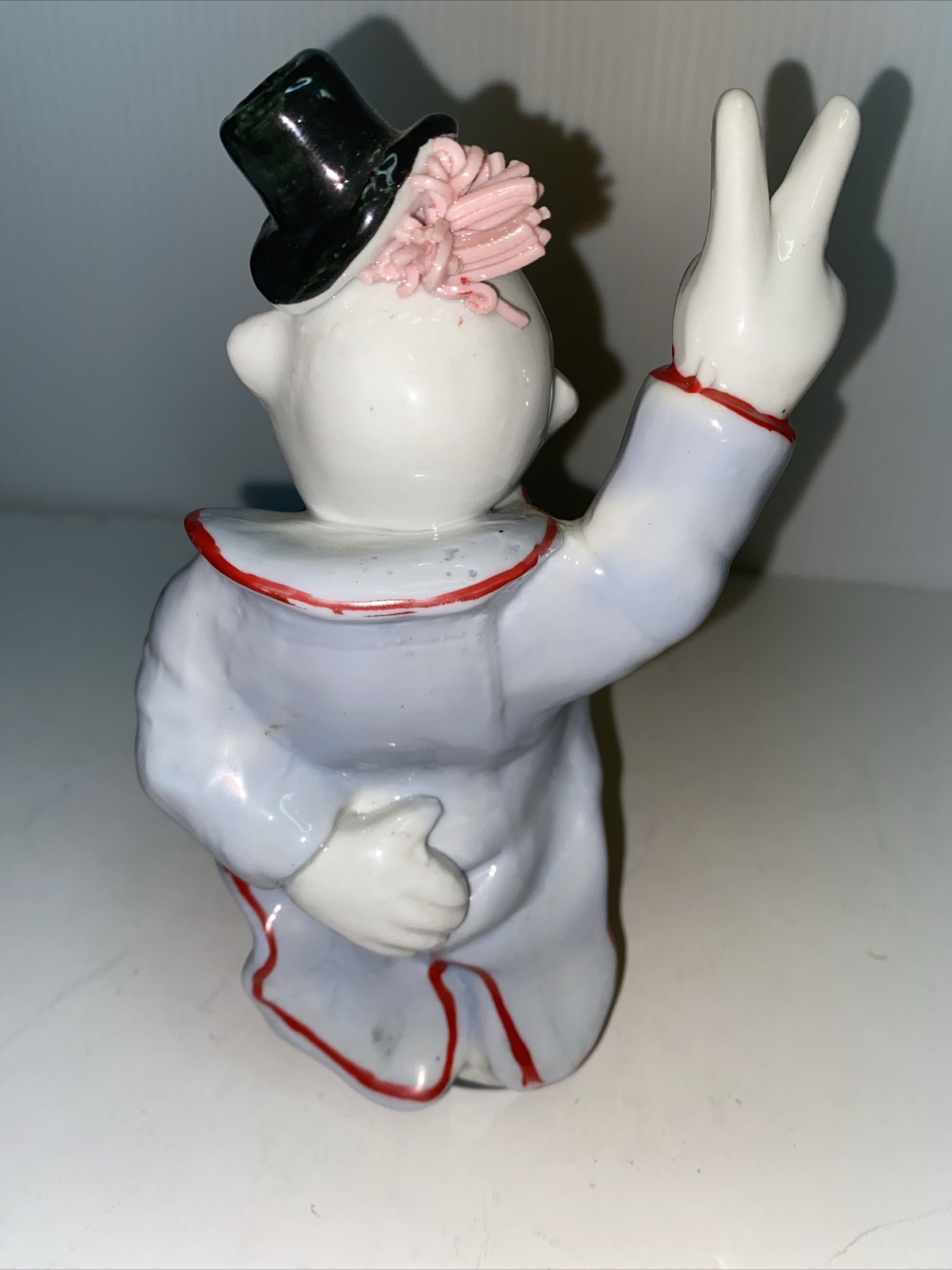 This vintage porcelain clown doll is an American style hobo circus character from the late 20th century. The hand-painted doll features a multicolor design, standing at 7 inches tall and 4 inches wide, with a weight of 1 lb. The clown doll is part of the Classic Collection and perfect for any room. The item comes unboxed and is an original production, with China country/region of manufacture. The doll features a clown character from the circus theme and is perfect for collectors and those who appreciate decorative sculptures and figurines. It was manufactured sometime between 1980-1989 and does not come signed. Old made in China tag, shown with pictures, Sold As Is and condition is very good, No chips or cracks. Photos are part of description.