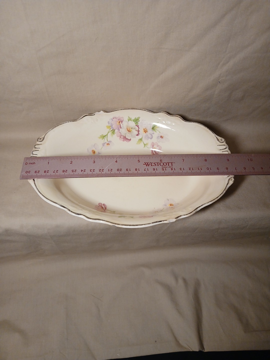 The Vintage Homer Laughlin Virginia Rose 9" Serving Bowl with Platinum Trim is a beautiful addition to any dining table. Made of bone china with a glossy finish, this oval-shaped bowl features a delicate pink and white Virginia Rose pattern, perfect for all occasions. This one-piece set includes a serving bowl with decorative platinum trim, showcasing the brand's original design. Hand wash only to preserve its vintage charm, this United States-made piece is a lovely choice for those who appreciate classic style and craftsmanship in their tableware collection.