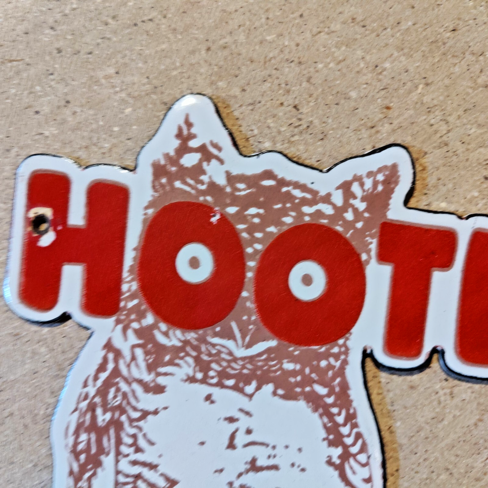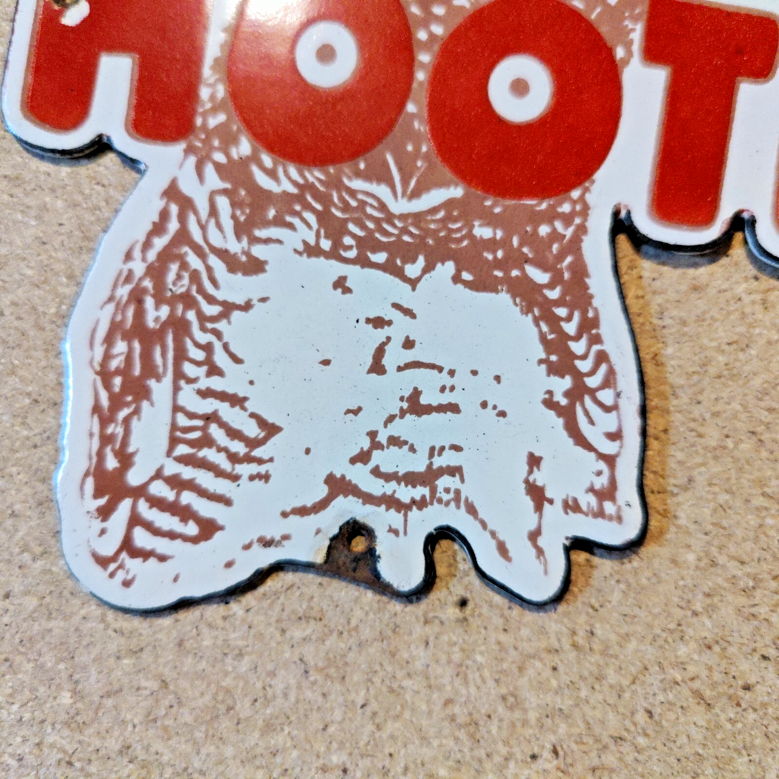 Delve into the charm of vintage Americana with this authentic HOOTERS Restaurants cat porcelain enamel metal sign. Measuring 9" x 6", this original piece hails from the heart of the United States, embodying the spirit of the Gas & Oil theme with its vivid, multi-colored design. Crafted between 1930 and 1969, it is a true testament to the enduring allure of classic advertising. This sign is a prized collectible that captures the essence of the era with its enamel finish, a hallmark of quality and durability. It is a delightful find for enthusiasts of porcelain signs, original signs, and vintage advertising memorabilia, ready to adorn your space with a touch of nostalgia and historical flair.