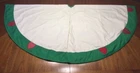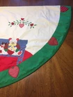 Vintage House of Hatten Appliqué Patchwork Toys Christmas Tree Skirt measures 59” across very pretty hard to find skirt in used condition has 4 hook eye closures fully intact. I have looked this over did not see any rips, tears or holes but there are few very tiny spots stains noted in the photos. I did not try to spot clean them or dry clean the skirt I am leaving that up to the new owner. Honestly they aren't that noticeable when placed under the tree. Needs to be ironed. See all photos for condition.