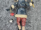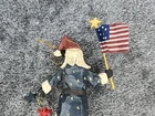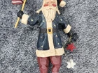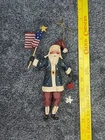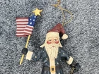 Vintage House of Hatten Patriotic Santa Christmas Ornament from 1996. This 8" resin ornament features a folk art design with a patriotic theme. It depicts Santa Claus in a multicolor outfit, making it a unique addition to any Christmas decor collection.