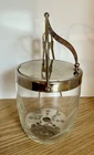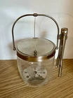 Vintage glass ice bucket with metal hinged lid and tongs. This item includes a hinged lid, hanging tongs and a small strainer at bottom. It has frosted wheat leaves etched in the glass. Approx size: with lid handle up is 9" tall (including handle) x 6 3/4" wide (including the tong handle) x 5" length (back to front)