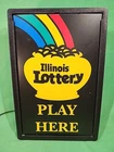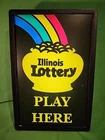 Vintage Illinois Lottery Play Here Pot of Gold lighted retail sign. Believed to be 1970's vintage, this advertising beauty hung in lottery retailers/convenience stores, etc. Unit measures approximately 23.5" tall, 16" wide, and 5" deep and is made of moulded plastic. Made by Palmer Promotional Products, it has hanging hooks on the top and wall mounting tabs on the back. This 110V unit lights up and uses a replaceable fluorescent bulb. It has a long cord with an inline switch for easy use. Sign is in good condition for its age but does have a few scratches on the sign face. Would be an awesome collector piece to hang in your bar, man cave, etc!! What you see is what you get, so please look the pictures over and judge for yourself! AS WITH ANY ITEMS, NO RETURNS ACCEPTED. Please allow a couple of days to get items to the post office. Please let us know if you have any questions, and thanks for looking!