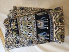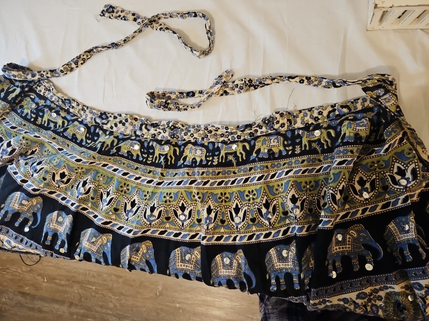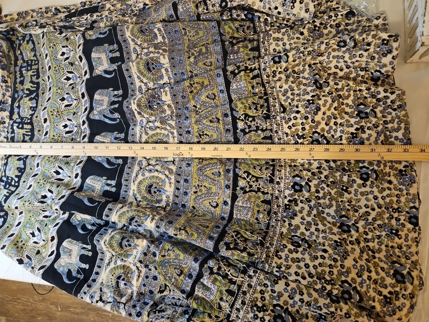 This vintage Indian wrap skirt in size small to medium features an elephant print design, perfect for those embracing a hippie or gypsy style. Made from lightweight cotton material, this multicolor skirt with sequin accents is ideal for travel or casual occasions, adding a touch of festival or bohemian flair to your wardrobe. The tie closure and mid-rise make it easy to wear, while the long length and wrap style offer both comfort and style for all seasons. 40 inches wide. On the inside, you can see the stitching and that it is hand-made. None the less is beautiful and a GREAT twirling skirt! See photos for more measurements.