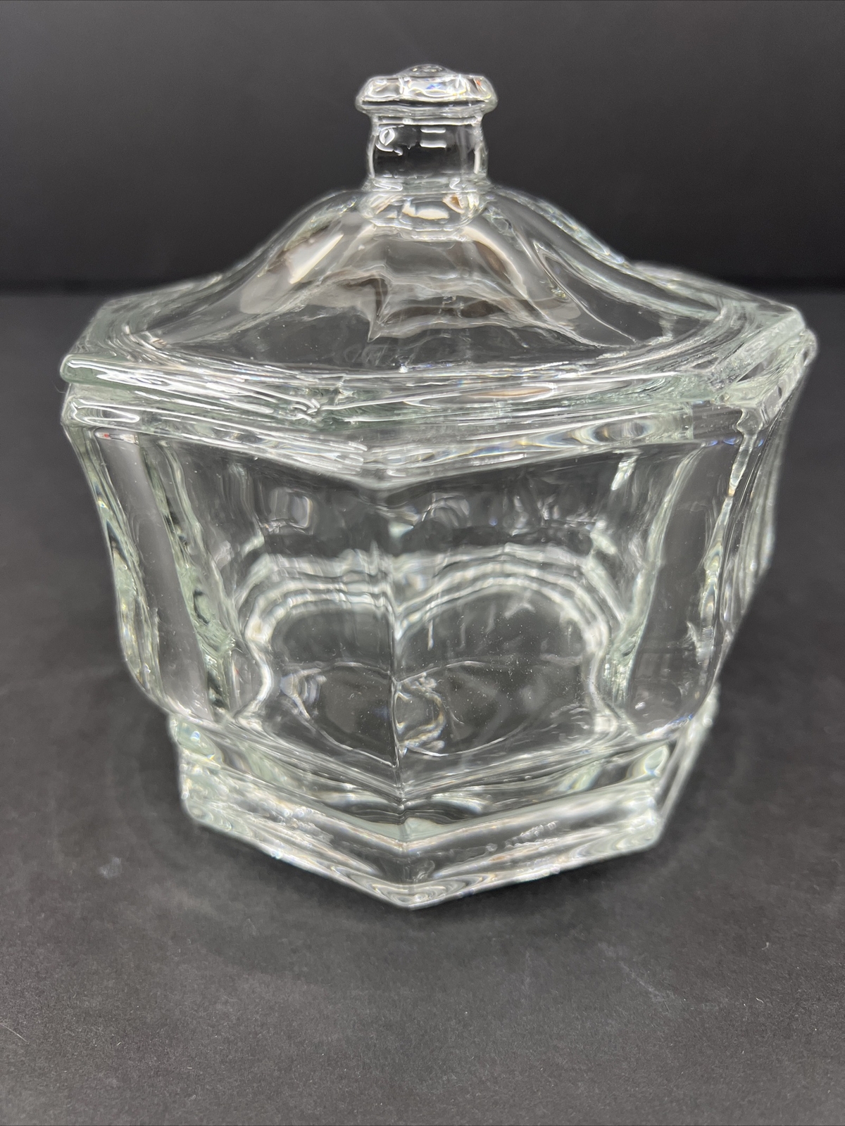 This vintage Indiana Glass candy dish is a charming addition to any collection. The clear glass and concord octagon shape give it a timeless appeal. Perfect for serving candy or other small treats, this dish is sure to impress. The lid adds an extra touch of elegance and keeps your treats fresh. Crafted from high-quality glass, this candy dish is durable and will last for years to come. Add it to your collection today!