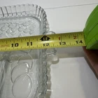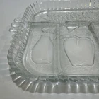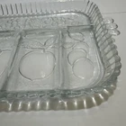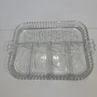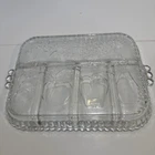 Vintage Indiana Glass divided serving tray in a rectangular shape with 5 sections for serving various fruits or relishes. Made of clear glass in a pressed glass production style, this glossy tray features a classic design from the Indiana Glass brand. It is an original piece with a vintage appeal, perfect for serving and displaying a variety of items. No chips or cracks!