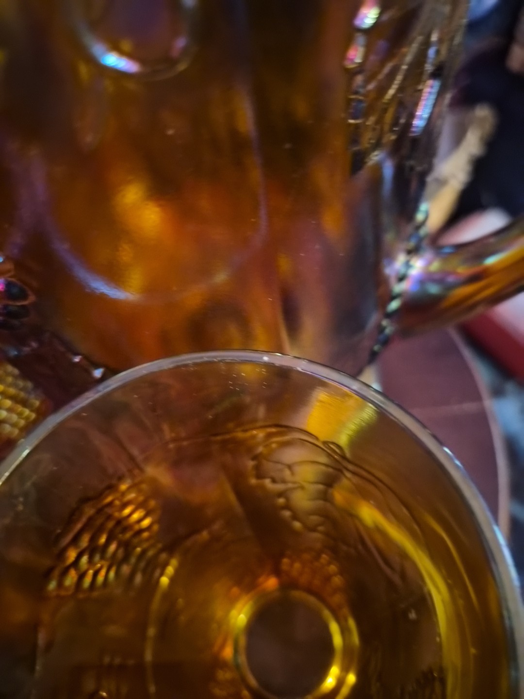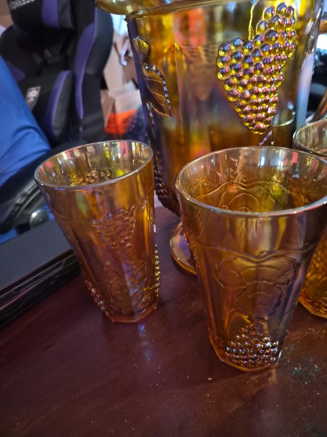 The Vintage Indiana Glass Harvest Grape 4 Piece Pitcher and 3 Tumblers set features a classic design with a carnival glass production style. Made by Indiana Glass, this set includes a pitcher and three tumblers, all crafted from glass in a beautiful Harvest Grape pattern. Perfect for serving beverages at any occasion, this set is a charming addition to any collection of decorative cookware and serveware.