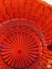 The Vintage Indiana Glass Honey Comb Pattern Serving Dish is a charming 8" round candy dish made of red glass in the United States. This decorative piece features a unique honey comb pattern design that adds a touch of retro elegance to any table setting. Perfect for serving candies, snacks, or desserts, this Indiana Glass dish brings a touch of nostalgia to your dining experience.