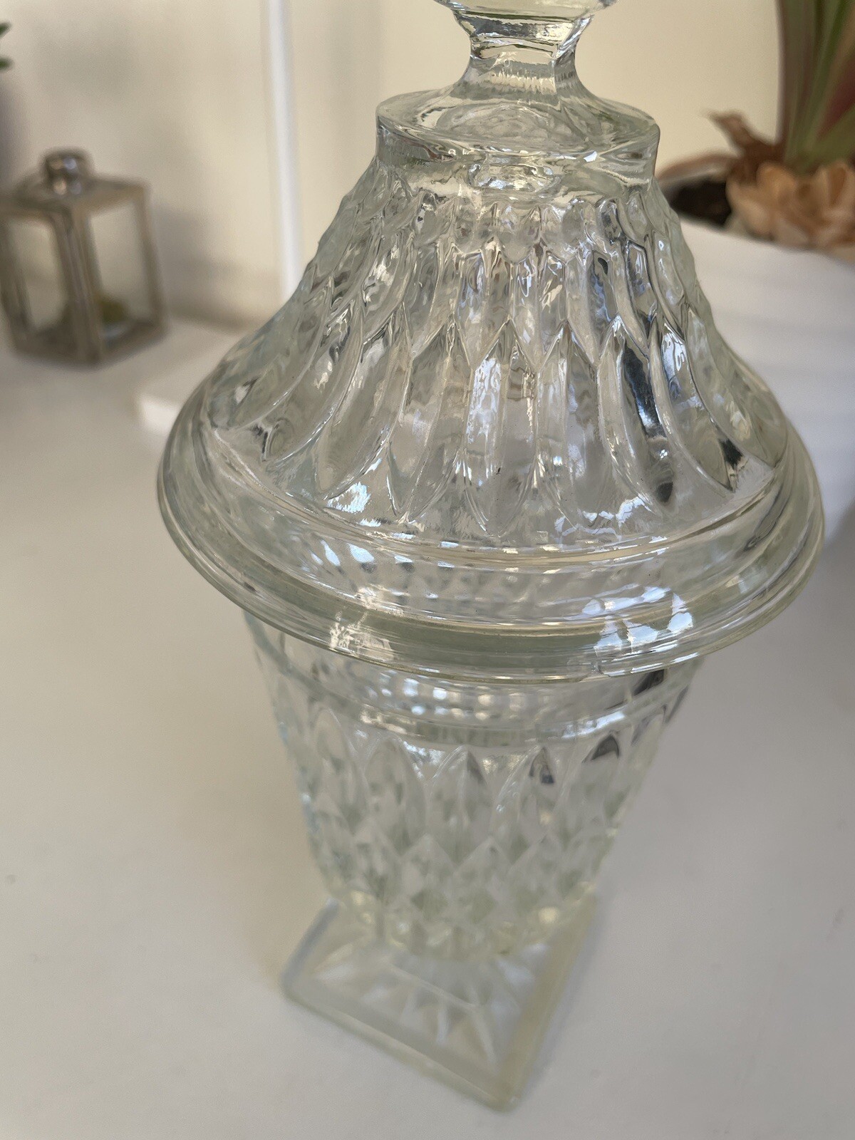 This vintage Mount Vernon candy dish by Indiana Glass Company is a round pedestal bowl with a lid, perfect for storing and displaying sweets. The design features a cut glass pattern in clear glass, giving it a timeless mid-century modern style. The dish is dishwasher safe, making it easy to clean and maintain. A lovely addition to any home, this covered candy dish is both functional and decorative, ideal for serving treats in style.