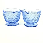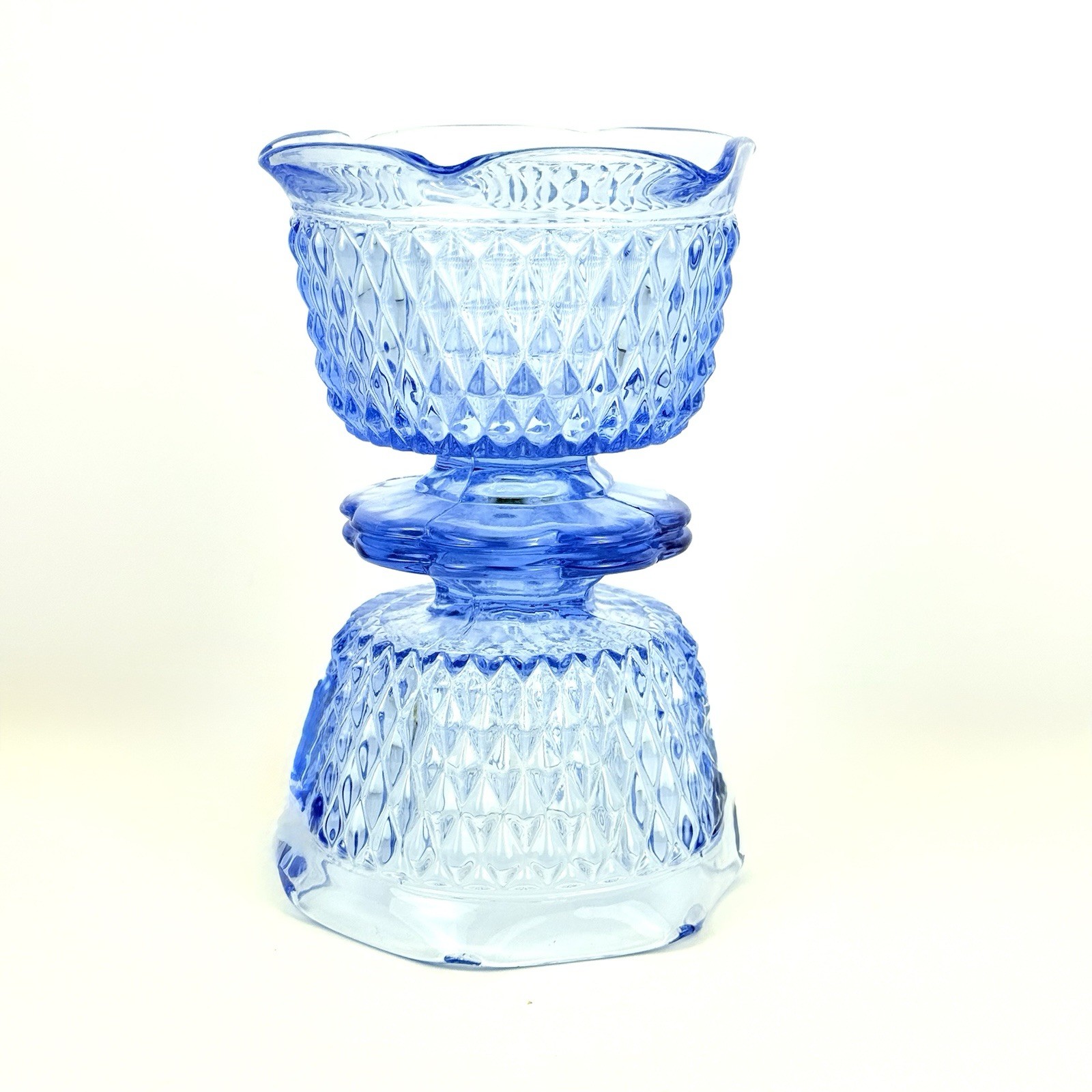 Vintage Indiana Glass Diamond point blue glass originally a mayo bowl, now can be used as a sherbet/dessert/fruit dish footed vintage blue glass mint condition 3 1/4" tall and a little less than 4" in diameter at opening Mint condition! It will make a wonderful addition to your depression glass collection! These are perfect little candy dishes for a boy baby shower too!! candle holders for the bathroom maybe? The ideas and uses are endless! Let me know what questions you have. Blessings to you! π©΅ππ©΅πππ©΅πππ©΅ππ©΅