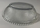Add a touch of vintage charm to your home decor with this beautiful Indiana Glass sleeping cat candy dish. The oval-shaped dish measures 7 inches and features a beaded edge pattern with a clear glass lid, making it a perfect addition to any collection of decorative cookware, dinnerware, and serveware. The dish is made of pressed glass and was produced in the United States, making it a high-quality and authentic piece. Not chips or cracks. Please review all pictures carefully. Thanks for looking!