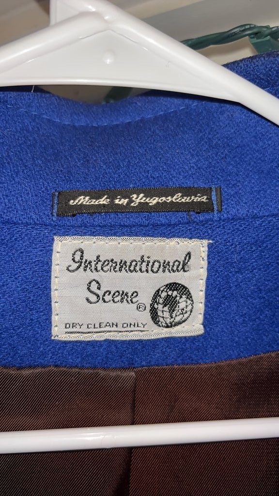 This is a vintage blue coat by International Scene, made in Yugoslavia. It features a classic design with button closures and two front pockets.